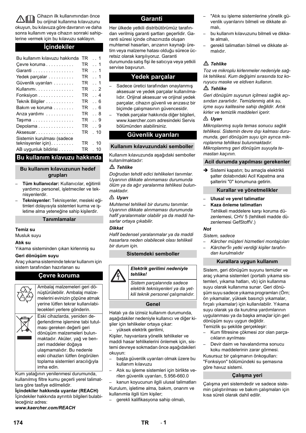 Tüm kullanıcılar: Kullanıcılar, eğitimli yardımcı personel, işletmeciler ve teknisyenlerdir. Teknisyenler: Teknisyenler, mesleki eğitimleri dolayısıyla sistemleri kurma ve işletime alma yeteneğine sahip kişilerdir. Tanımlamalar Temiz su Musluk suyu Atık su Yıkama sisteminden çıkan kirlenmiş su Geri dönüşüm suyu Araç yıkama sisteminde tekrar kullanım için sistem tarafından hazırlanan su Çevre koruma Ambalaj malzemeleri geri dönüştürülebilir. Ambalaj malzemelerini evinizin çöpüne atmak yerine lütfen tekrar kullanılabilecekleri yerlere gönderin. Eski cihazlarda, yeniden değerlendirme işlemine tabi tutulması gereken değerli geri dönüşüm malzemeleri bulunmaktadır. Aküler, yağ ve benzeri maddeler doğaya ulaşmamalıdır. Bu nedenle eski cihazları lütfen öngörülen toplama sistemleri aracılığıyla imha edin. Kum yatağının yenilenmesi durumunda, kullanılmış filtre kumu geçerli yerel talimatlara göre tasfiye edilmelidir. İçindekiler hakkında uyarılar (REACH) İçindekiler hakkında ayrıntılı bilgileri bulabileceğiniz adres: www.kaercher.com/REACH