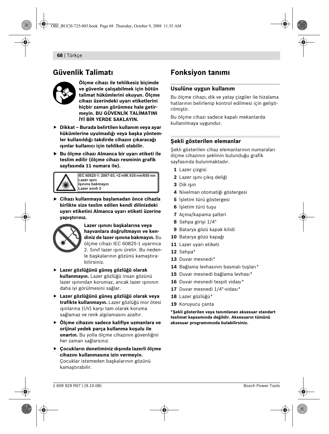 Ölçme cihaz ile tehlikesiz biçimde ve güvenle çalşabilmek için bütün talimat hükümlerini okuyun. Ölçme cihaz üzerindeki uyar etiketlerini hiçbir zaman görünmez hale getirmeyin. BU GÜVENLİK TALİMATINI İYİ BİR YERDE SAKLAYIN. f Dikkat – Burada belirtilen kullanm veya ayar hükümlerine uyulmadğ veya başka yöntemler kullanldğ takdirde cihazn çkaracağ şnlar kullanc için tehlikeli olabilir. f Bu ölçme cihaz Almanca bir uyar etiketi ile teslim edilir (ölçme cihaz resminin grafik sayfasnda 11 numara ile). IEC 60825-1: 2007-03, <2 mW, 635 nm/650 nm Lazer ışını Işınına bakmayın Lazer sınıfı 2 f Cihaz kullanmaya başlamadan önce cihazla birlikte size teslim edilen kendi dilinizdeki uyar etiketini Almanca uyar etiketi üzerine yapştrnz. Lazer şnn başkalarna veya hayvanlara doğrultmayn ve kendiniz de lazer şnna bakmayn. Bu ölçme cihaz IEC 60825-1 uyarnca