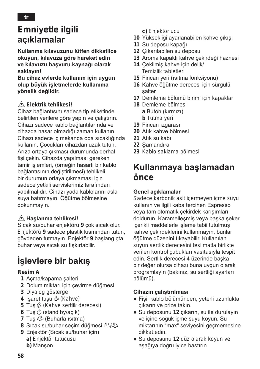 Cihaz bağlantısını sadece tip etiketinde belirtilen verilere göre yapın ve çalıştırın. Cihazı sadece kablo bağlantılarında ve cihazda hasar olmadığı zaman kullanın. Cihazı sadece iç mekanda oda sıcaklığında kullanın. Çocukları cihazdan uzak tutun. Arıza ortaya çıkması durumunda derhal fişi çekin. Cihazda yapılması gereken tamir işlemleri, (örneğin hasarlı bir kablo bağlantısının değiştirilmesi) tehlikeli bir durumun ortaya çıkmaması için sadece yetkili servislerimiz tarafından yapılmalıdır. Cihazı yada kablolarını asla suya batırmayın. Öğütme bölmesine dokunmayın. ! Haşlanma tehlikesi! Sıcak su/buhar enjektörü 9 çok sıcak olur. Enjektörü 9 sadece plastik kısmından tutun, gövdeden tutmayın. Enjektör 9 başlangıçta buhar veya sıcak su fışkırtabilir.