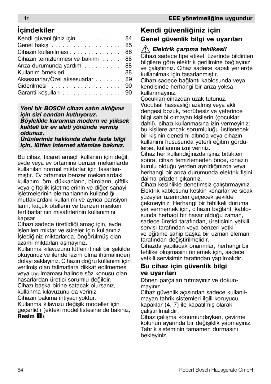 Genel güvenlik bilgi ve uyarýlarý Elektrik çarpma tehlikesi! Cihazý sadece tipe etiketi üzerinde bildirilen bilgilere göre elektrik gerilimine baðlayýnýz ve çalýþtýrýnýz. Cihaz sadece kapalý yerlerde kullanýlmak için tasarlanmýþtýr. Cihazý sadece baðlantý kablosunda veya kendisinde herhangi bir arýza yoksa kullanmayýnýz. Çocuklarý cihazdan uzak tutunuz. Vücutsal hassaslýðý azalmýþ veya akli dengesi bozuk, tecrübesiz ve yeterince bilgi sahibi olmayan kiþilerin (çocuklar dahil), cihazý kullanmasýna izin vermeyiniz; bu kiþilere ancak sorumluluðu üstlenecek bir kiþinin denetimi altýnda veya cihazýn kullanýmý hususunda yeterli eðitim gördülerse, kullanma izni veriniz. Cihaz her kullandýðýnýzda iþiniz bittikten sonra, cihazý temizlemeden önce, cihazýn kurulu olduðu yerden ayrýldýðýnýzda veya herhangi bir arýza durumunda elektrik fiþini daima prizden çýkarýnýz. Cihazý kesinlikle denetimsiz çalýþtýrmayýnýz. Elektrik kablosunu keskin kenarlar ve sýcak yüzeyler üzerinden geçecek þekilde çekmeyiniz. Herhangi bir tehlikeli duruma yer vermemek için, cihazýn baðlantý kablosunda herhagi bir hasar olduðu zaman, sadece üretici tarafýndan, üreticinin yetkili servisi tarafýndan veya benzeri yetki ve eðitime sahip baþka bir uzman eleman tarafýndan deðiþtirilmelidir. Cihazda yapýlacak onarýmlar, herhangi bir tehlike oluþmasýný önlemek için, sadece yetkili servisimiz tarafýndan yapýlmalýdýr. Bu cihaz için güvenlik bilgi ve uyarýlarý Dönen parçalarý tutmayýnýz ve dokunmayýnýz. Cihaz güvenlik açýsýndan sadece kullanýlmayan tahrik sistemleri ilgili koruyucu kapaklar (4, 7) ile kapatýlmýþ olarak çalýþtýrýlmalýdýr. Cihaz çalýþma konumundayken, çevirme kolunun ayarýnda bir deðiþiklik yapmayýnýz. Tahrik sisteminin tamamen durmasýný bekleyiniz. Robert Bosch Hausgeräte GmbH