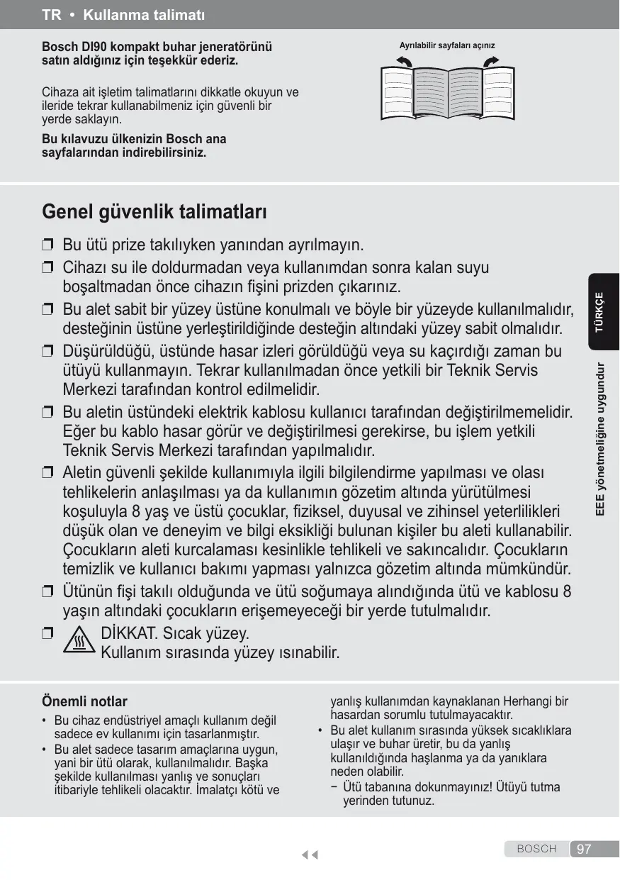 TR • Kullanma talimatı Bosch DI90 kompakt buhar jeneratörünü satın aldığınız için teşekkür ederiz.