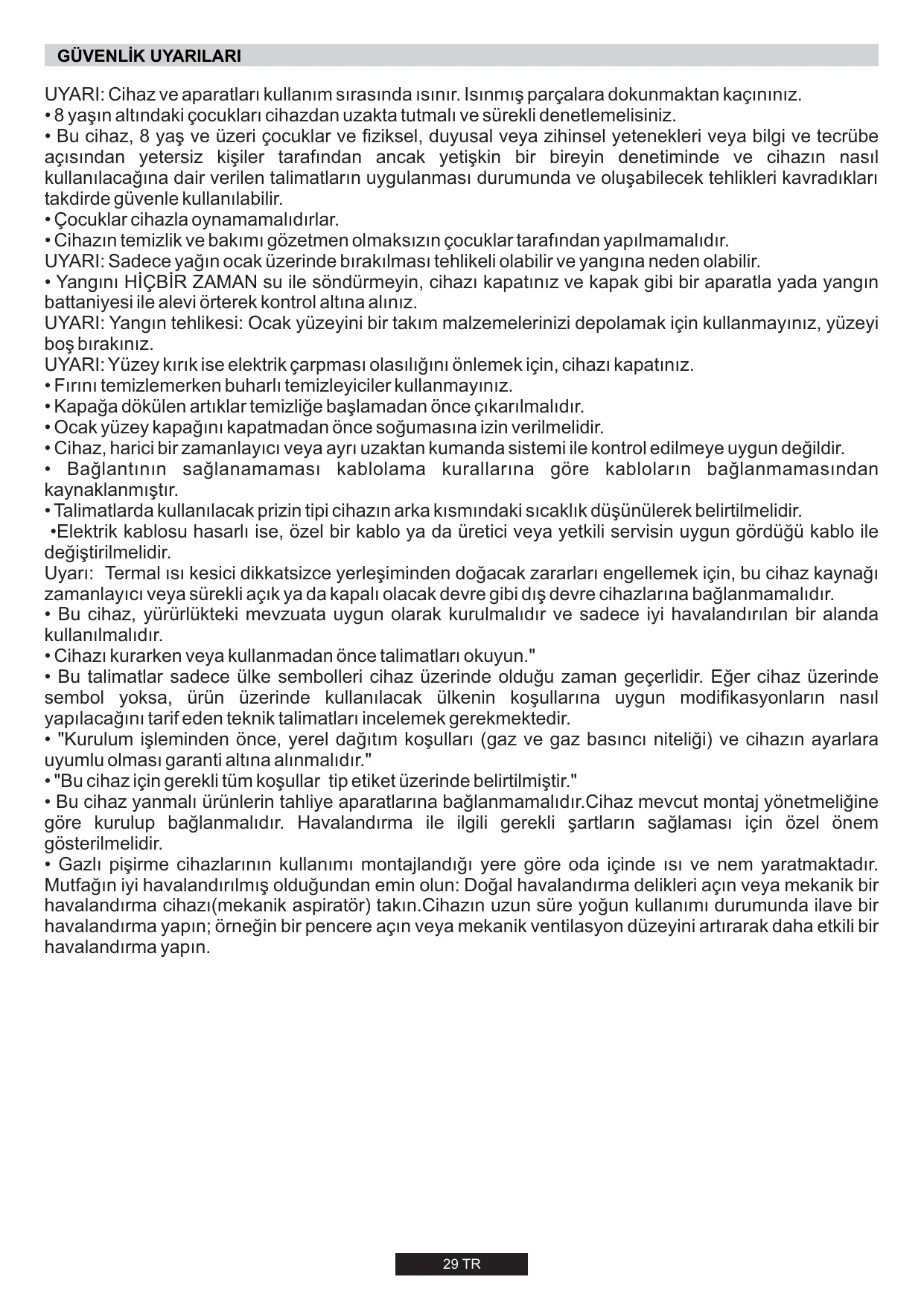 - Gazlı pişirme cihazlarının kullanımı montajlandığı yere göre oda içinde ısı ve nem yaratmaktadır. Mutfağın iyi havalandırılmış olduğundan emin olun: Doğal havalandırma delikleri açın veya mekanik bir havalandırma cihazı(mekanik aspiratör) takın.Cihazın uzun süre yoğun kullanımı durumunda ilave bir havalandırma yapın; örneğin bir pencere açın veya mekanik ventilasyon düzeyini artırarak daha etkili bir havalandırma yapın. 29 TR