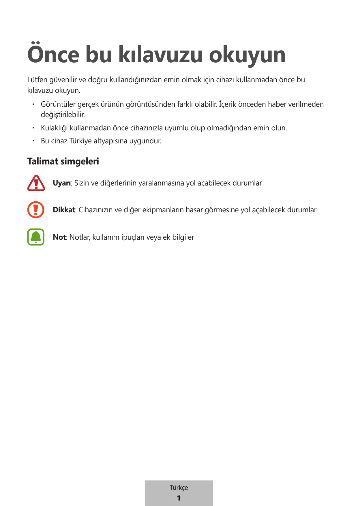 - Bu cihaz Türkiye altyapısına uygundur. Talimat simgeleri Uyarı: Sizin ve diğerlerinin yaralanmasına yol açabilecek durumlar Dikkat: Cihazınızın ve diğer ekipmanların hasar görmesine yol açabilecek durumlar Not: Notlar, kullanım ipuçları veya ek bilgiler Türkçe