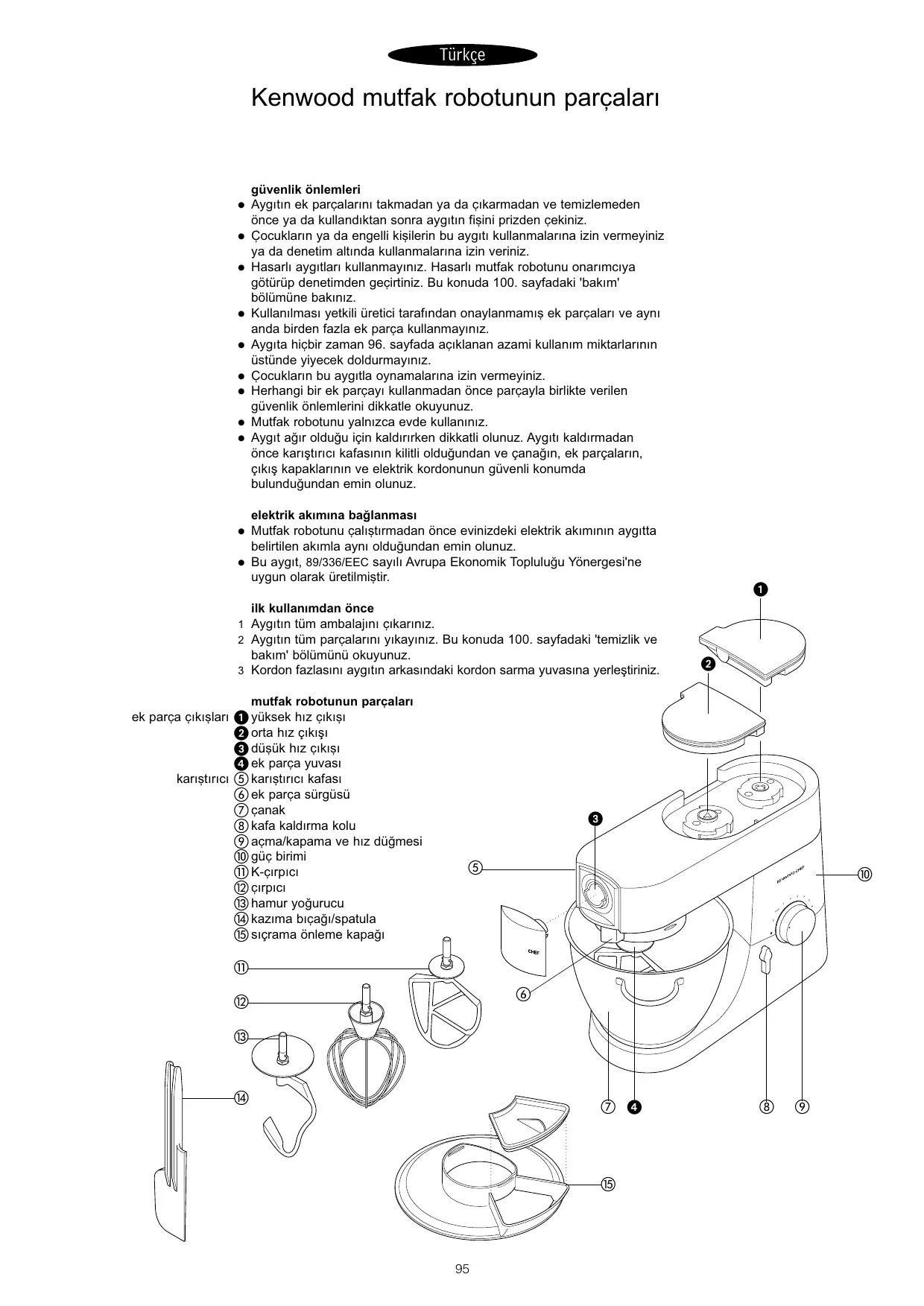 €k parça cikislari karistirici Kenwood mutfak robotunun parçalari güvenlik ônlemleri Aygitin ek parçalarini takmadan ya da cikarmadan ve temizlemeden ënce ya da kullandiktan sonra aygitin fisini prizden çekiniz. Gocuklarin ya da engelli kisilerin bu aygiti kullanmalarina izin vermeyiniz ya da denetim altinda kullanmalarina izin veriniz. Hasarli aygitlart kullanmayiniz. Hasarli mutfak robotunu onarimciya gôtürüp denetimden gecirtiniz. Bu konuda 100. sayfadaki ‘bakim' bôlümüne bakiniz. Küullanimasi yetkil üretici tarafindan onaylanmamis ek parçalari ve ayni anda birden fazla ek parça kullanmayiniz. Aygita hiçbir zaman 6. sayfada açiklanan azami kullanim miktarlarinin üstünde yiyecek doldurmaynez. Gocuklarin bu aygitla oynamalarina izin vermeyiniz. Herhangi bir ek parçayt kullanmadan ônce parçayla birlikte verilen güvenlik ônlemlerini dikkatle okuyunuz. Mutfak robotunu yalnizca evde kullaniniz. Aygit aÿir oldugu için kaldirirken dikkatli olunuz. Aygiti kaldirmadan ënce karistirici kafasinin kilili oldugundan ve çanaÿin, ek parçalarin, çikis kapaklarinin ve elektrik kordonunun güvenli konumda bulundugundan emin olunuz. elektrik akimina baÿlanmasi Mutfak robotunu çalistirmadan ônce evinizdeki elektrik akiminin aygitta belirtilen akimla ayni oldugundan emin olunuz. Bu aygit, 89/336/EEC saylli Avrupa Ekonomik Toplulugu Yônergesi'ne uygun olarak üretilmistir. ilk kullanimdan ônce Aygitin tüm ambalajini çikariniz. Aygitin tüm parçalanini yikayiniz. Bu konuda 100. sayfadaki temizlik ve bakim' bôlümünü okuyunuz. Kordon fazlasini aygitin arkasindaki kordon sarma yuvasina yerlestiriniz. N =