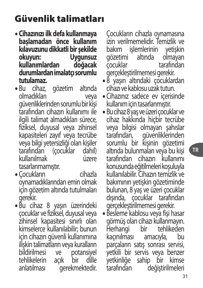 Güvenlik talimatlar: + Cihazinizr ilk defa kullanmaya baslamadan ünce kullanim kilavuzunu dikkatli bir sekilde okuyun: Uygunsuz kullanmlardan doÿacak durumlardan imalatsorumlu tutulamaz. eBu chaz gôzetim altnda olmadiklart veya güvenliklerinden sorumlu bir kisi farafindan dihazin kullanimi ile ilgili talimat almadiklani sürece, fiziksel, duyusal veya zihinsel kapasiteleri zayif veya tecrübe veya bilgi yetersizligi olan kisiler tarafindan (çocuklar dahil) kullanilmak üzere tasarlanmamistir. + Çocuklarin cihazla oynamadiklanndan emin olmak için gôzetim altinda tutulmalant gerekir. eBu cihaz 8 vasn üzerindeki çocuklar ve fiziksel, duyusal veya zihinsel kapasitesi sinirl olan kimselerce Klantabiie bunun için cihazin güvenli kullanimina iliskin talimatlann veya kurallann bildirilmesi ve potansiyel tehlikelerin agk bir dille anlatlmasi gerekmektedir. Çocuklarn cihazla oynamasina izin verilmemelidir. Temizlik ve bakim _ islemlerinin yetiskin gôzetimi altnda olmayan çocuklar tarafindan gerçeklestirilmemesi gerekir. +8 yasn altndaki çocuklardan cihazive kablosu uzaktutun. e Gihazniz sadece ev icerisinde kullanim için tasarlanmistir. + Bu cihaz8 yas ve Üzeri cocuklarve dhaz hakkinda hiçbir tecrübe veya bilgisi olmayan sahislar tarafindan, … güvenliklerinden sorumlu ir ü inin gôzetimi altinda bulunmaan veya bu kisi tarafindan cihazn Yulenmi Konusunda editilmeleri kosuluyla kullanilabilir. Cihazin terizlik ve bakiminin yetiskin gôzetiminde bulunan, 8 as ve Üzeri cocuklar disnda, çocuklar tarafindan gercxesurimemes gere + Besleme kablosu veya fisi hasar gôrmüs olan cihaz kullanmayin. Herhangi bir tehlikeden kagnilmas amacyla, bu parçalarn satis sonrasi servisi, yetkili bir servis veya benzer yetkinliÿe sahip br kimse tarafindan deÿistirilmeleri