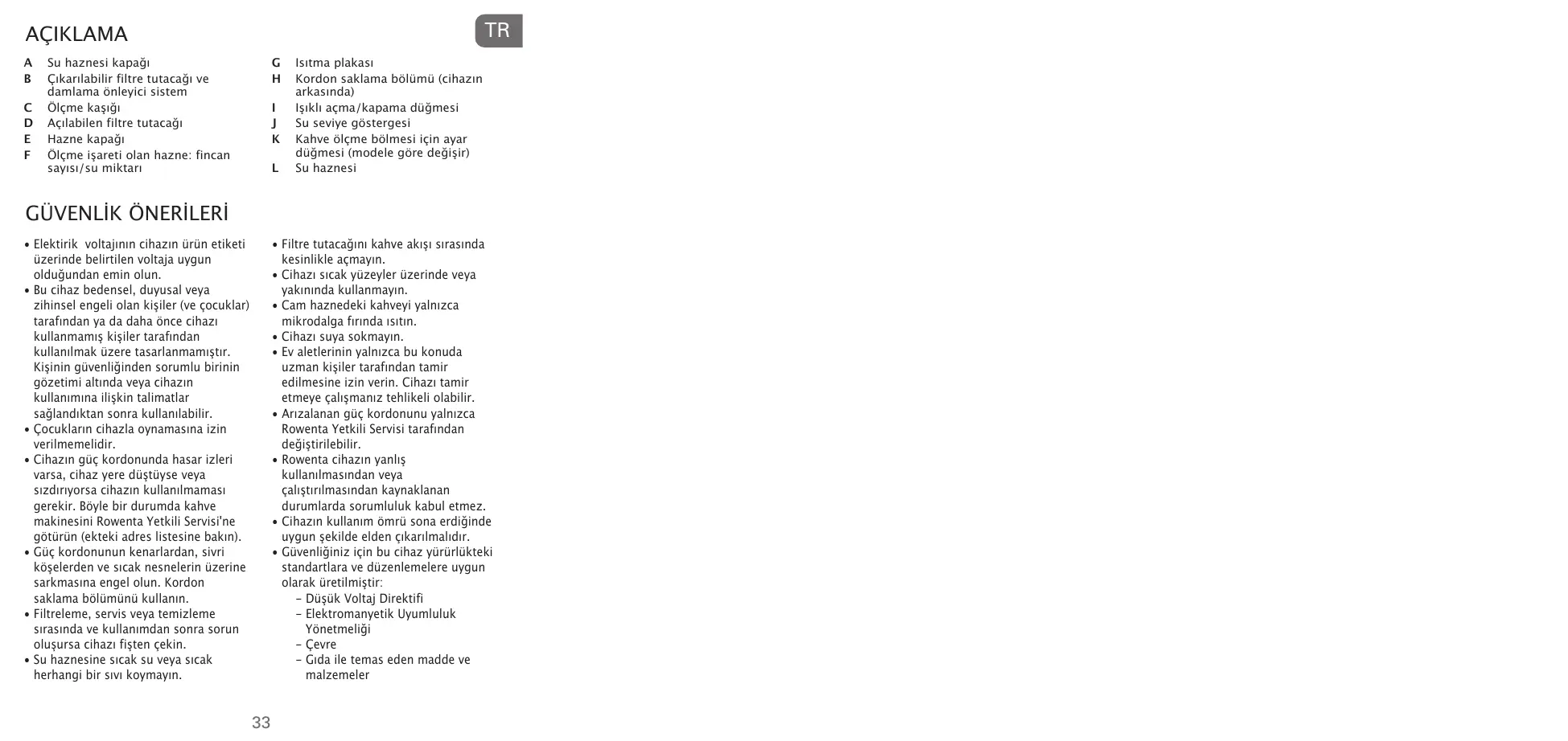 • Ne pas poser ou utiliser l'appareil sur ou à proximité de surfaces chaudes. • Rechauffer le café dans la verseuse uniquement dans un four à micro-ondes. • Ne pas immerger l'appareil. • Ne confier les réparations d'appareils électroménagers qu'à des spécialistes. Réparer un appareil soi-même peut constituer un danger pour l'utilisateur. • Un cordon défectueux doit exclusivement être changé par un Centre Service agréé Rowenta pour éviter tout risque. • Pour d'éventuelles détériorations de l'appareil dues à une utilisation inappropriée ou non conforme au mode d'emploi, aucune responsabilité ne peut engager Rowenta. • À la fin de la durée de vie de l'appareil, il y a lieu de l'évacuer de façon appropriée.