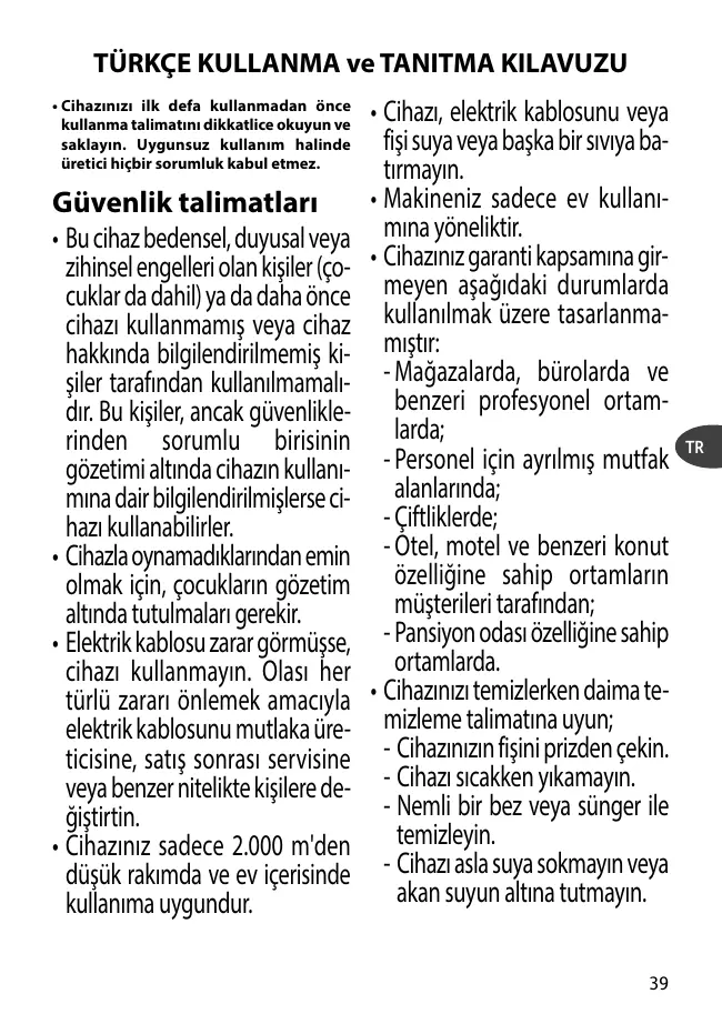 à 2000 m. • Ne pas mettre l’appareil, le câble d’alimentation ou la fiche dans l’eau ou tout autre liquide. • Votre machine a été conçue pour un usage domestique seulement. • Elle n’a pas été conçue pour être utilisée dans les cas suivants qui ne sont pas couverts par la garantie: - Dans des coins de cuisines réservés au personnel dans des magasins, bureaux et autres environnements professionnels ; Dans des fermes ; Par les clients des hôtels, motels et autres environnements à caractère résidentiel ; Dans des environnements de type chambres d’hôtes. • Toujours suivre les instructions de nettoyage pour nettoyer votre appareil; - Débrancher l’appareil. - Ne pas nettoyer l’appareil chaud. - Nettoyer avec un chiffon ou une éponge humide. 7