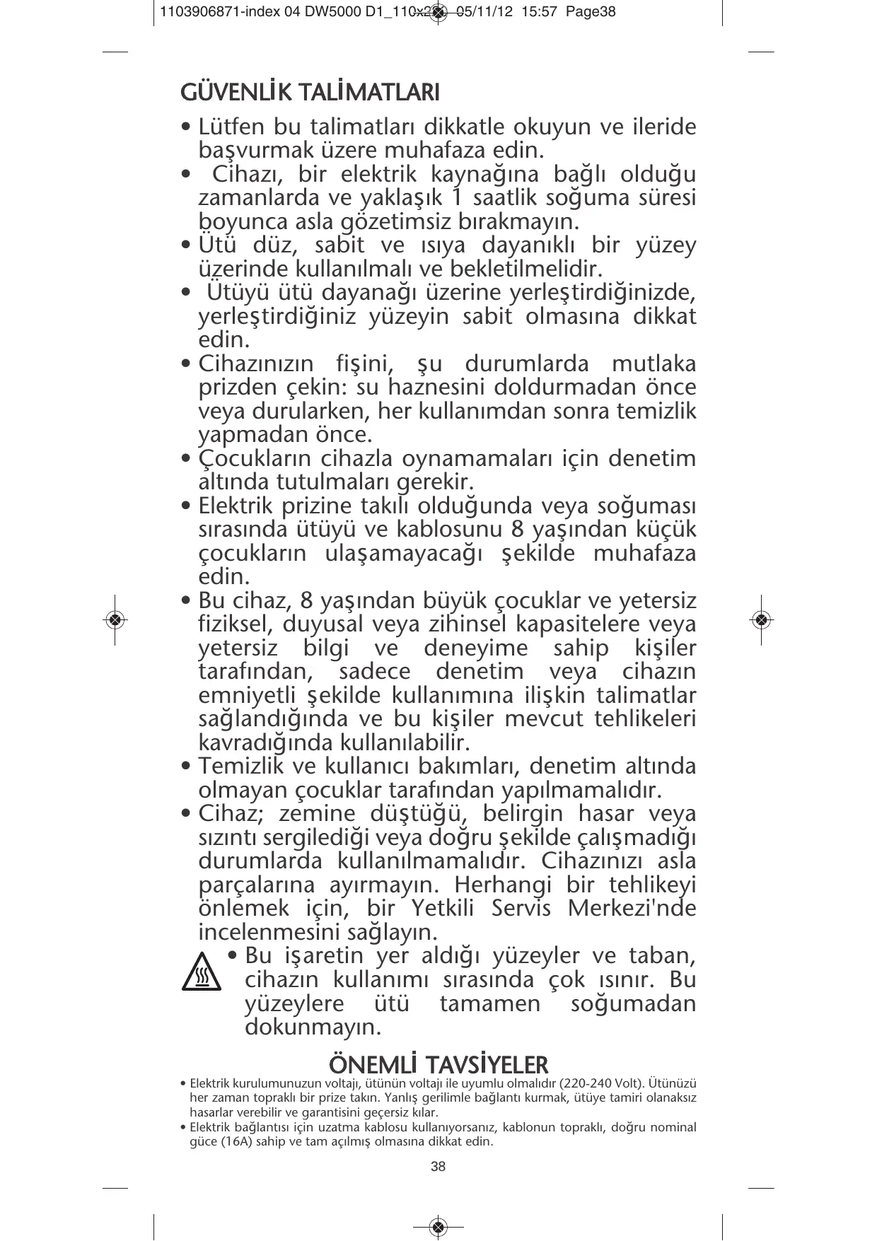 • Ne laissez jamais l’appareil sans surveillance lorsqu’il est raccordé à l’alimentation électrique ; tant qu’il n’a pas refroidi environ 1 heure. • Le fer doit être utilisé et posé sur une surface plane, stable et résistante à la chaleur. • Lorsque vous posez le fer sur le repose-fer, assurez-vous que la surface sur laquelle vous le posez est stable. • Débranchez toujours votre appareil : avant de le remplir ou de rincer le réservoir, avant de le nettoyer, après chaque utilisation. • Il convient de surveiller les enfants pour s’assurer qu’ils ne jouent pas avec l’appareil. • Maintenir le fer et le cordon hors de portée des enfants de moins de 8 ans lorsqu'il est branché ou qu'il refroidit. • Cet appareil peut être utilisé par des enfants âgés de 8 ans ou plus et des personnes dont les capacités physiques, sensorielles ou mentales sont réduites, ou des personnes dénuées d’expérience et de connaissance, s'ils ont pu bénéficier d’une surveillance ou d’instructions préalables concernant la manière d’utiliser l’appareil en toute sécurité et qu'ils comprennent les dangers potentiels. • Les enfants ne doivent pas effectuer le nettoyage et l'entretien sans surveillance. • Ne pas utiliser l'appareil s'il est tombé au sol, présente des dommages apparents, fuit ou ne fonctionne pas correctement. Ne jamais démonter l'appareil. Faites-le examiner dans un centre service agréé, afin d’éviter tout danger. • Les surfaces marquées par ce signe et la semelle sont très chaudes lors de l'utilisation de l'appareil. Ne pas toucher ces surfaces tant que le fer n'a pas refroidi. RECOMMANDATIONS IMPORTANTES • La tension de votre installation électrique doit correspondre à celle du fer (220-240 V). Ce fer doit être toujours branché sur une prise de courant avec terre. Toute erreur de branchement peut endommager le fer de manière irréversible et annulera la garantie.