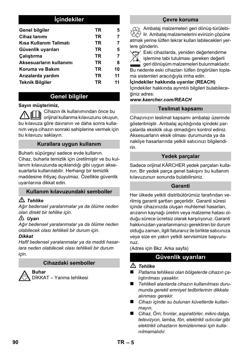 Genel bilgiler Sayın müşterimiz, Cihazın ilk kullanımından önce bu orijinal kullanma kılavuzunu okuyun, bu kılavuza göre davranın ve daha sonra kullanım veya cihazın sonraki sahiplerine vermek için bu kılavuzu saklayın. Kurallara uygun kullanım Buharlı süpürgeyi sadece evde kullanın. Cihaz, buharla temizlik için üretilmiştir ve bu kullanım kılavuzunda açıklandığı gibi uygun aksesuarlarla kullanılabilir. Herhangi bir temizlik maddesine ihtiyaç duyulmaz. Özellikle güvenlik uyarılarına dikkat edin. Kullanım kılavuzundaki semboller Tehlike Ağır bedensel yaralanmalar ya da ölüme neden olan direkt bir tehlike için. 몇 Uyarı Ağır bedensel yaralanmalar ya da ölüme neden olabilecek olası tehlikeli bir durum için. Dikkat Hafif bedensel yaralanmalar ya da maddi hasarlara neden olabilecek olası tehlikeli bir durum için. Cihazdaki semboller Buhar DİKKAT – Yanma tehlikesi Ambalaj malzemeleri geri dönüş-türülebilir. Ambalaj malzemelerini evinizin çöpüne atmak yerine lütfen tekrar kullan labilecekleri yerlere gönderin. Eski cihazlarda, yeniden değerlendirme işlemine tabi tutulması gereken değerli geri dönüşüm malzemeleri bulunmaktadır. Bu nedenle eski cihazları lütfen öngörülen toplama sistemleri aracılığıyla imha edin. İçindekiler hakkında uyarılar (REACH) İçindekiler hakkında ayrıntılı bilgileri bulabileceğiniz adres: www.kaercher.com/REACH Teslimat kapsamı Cihazınızın teslimat kapsamı ambalajı üzerinde gösterilmiştir. Ambalaj açıldığında içindeki parçalarda eksiklik olup olmadığını kontrol ediniz. Aksesuarların eksik olması durumunda ya da nakliye hasarlarında yetkili satıcınızı bilgilendirin. Yedek parçalar Sadece orijinal KÄRCHER yedek parçaları kullanın. Bir yedek parça genel bakışını bu kullanım kılavuzunun sonunda bulabilirsiniz. Garanti Her ülkede yetkili distribütörümüz tarafından verilmiş garanti şartları geçerlidir. Garanti süresi içinde cihazınızda oluşan muhtemel hasarları, arızanın kaynağı üretim veya malzeme hatası olduğu sürece ücretsiz olarak karşılıyoruz. Garanti hakkınızdan yararlanmanızı gerektiren bir durum olduğu zaman, ilgili faturanız ile birlikte satıcınıza veya size en yakın yetkili servisimize başvurunuz. (Adres için Bkz. Arka sayfa) Güvenlik uyarıları Tehlike Patlama tehlikesi olan bölgelerde cihazın çalıştırılması yasaktır. Tehlikeli alanlarda cihazın kullanılması durumunda gerekli emniyet tedbirlerinin dikkate alınması gerekir. Cihazı içinde su bulunan küvetlerde kullanmayın. Cihaz, Örn; fırınlar, aspiratörler, mikro dalga, televizyon, lamba, fön, elektrikli ısıtıcılar gibi elektrikli cihazların temizlenmesi için kullanılmamalıdır.