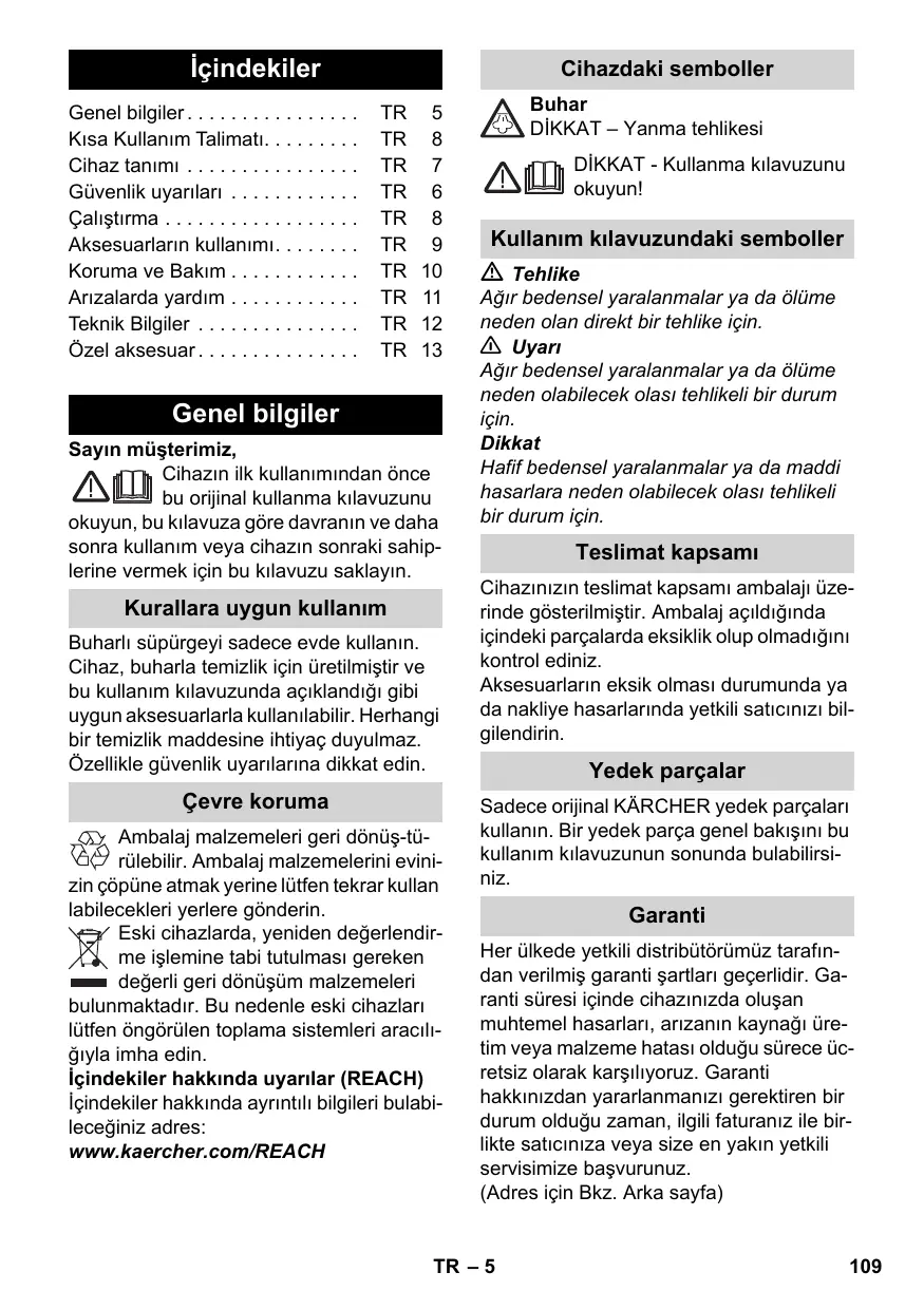 Genel bilgiler Sayın müşterimiz, Cihazın ilk kullanımından önce bu orijinal kullanma kılavuzunu okuyun, bu kılavuza göre davranın ve daha sonra kullanım veya cihazın sonraki sahiplerine vermek için bu kılavuzu saklayın. Kurallara uygun kullanım Buharlı süpürgeyi sadece evde kullanın. Cihaz, buharla temizlik için üretilmiştir ve bu kullanım kılavuzunda açıklandığı gibi uygun aksesuarlarla kullanılabilir. Herhangi bir temizlik maddesine ihtiyaç duyulmaz. Özellikle güvenlik uyarılarına dikkat edin. Çevre koruma Ambalaj malzemeleri geri dönüş-türülebilir. Ambalaj malzemelerini evinizin çöpüne atmak yerine lütfen tekrar kullan labilecekleri yerlere gönderin. Eski cihazlarda, yeniden değerlendirme işlemine tabi tutulması gereken değerli geri dönüşüm malzemeleri bulunmaktadır. Bu nedenle eski cihazları lütfen öngörülen toplama sistemleri aracılığıyla imha edin. İçindekiler hakkında uyarılar (REACH) İçindekiler hakkında ayrıntılı bilgileri bulabileceğiniz adres: www.kaercher.com/REACH Buhar DİKKAT – Yanma tehlikesi DİKKAT - Kullanma kılavuzunu okuyun! Kullanım kılavuzundaki semboller Tehlike Ağır bedensel yaralanmalar ya da ölüme neden olan direkt bir tehlike için. 몇 Uyarı Ağır bedensel yaralanmalar ya da ölüme neden olabilecek olası tehlikeli bir durum için. Dikkat Hafif bedensel yaralanmalar ya da maddi hasarlara neden olabilecek olası tehlikeli bir durum için. Teslimat kapsamı Cihazınızın teslimat kapsamı ambalajı üzerinde gösterilmiştir. Ambalaj açıldığında içindeki parçalarda eksiklik olup olmadığını kontrol ediniz. Aksesuarların eksik olması durumunda ya da nakliye hasarlarında yetkili satıcınızı bilgilendirin. Yedek parçalar Sadece orijinal KÄRCHER yedek parçaları kullanın. Bir yedek parça genel bakışını bu kullanım kılavuzunun sonunda bulabilirsiniz. Garanti Her ülkede yetkili distribütörümüz tarafından verilmiş garanti şartları geçerlidir. Garanti süresi içinde cihazınızda oluşan muhtemel hasarları, arızanın kaynağı üretim veya malzeme hatası olduğu sürece ücretsiz olarak karşılıyoruz. Garanti hakkınızdan yararlanmanızı gerektiren bir durum olduğu zaman, ilgili faturanız ile birlikte satıcınıza veya size en yakın yetkili servisimize başvurunuz. (Adres için Bkz. Arka sayfa) TR – 5