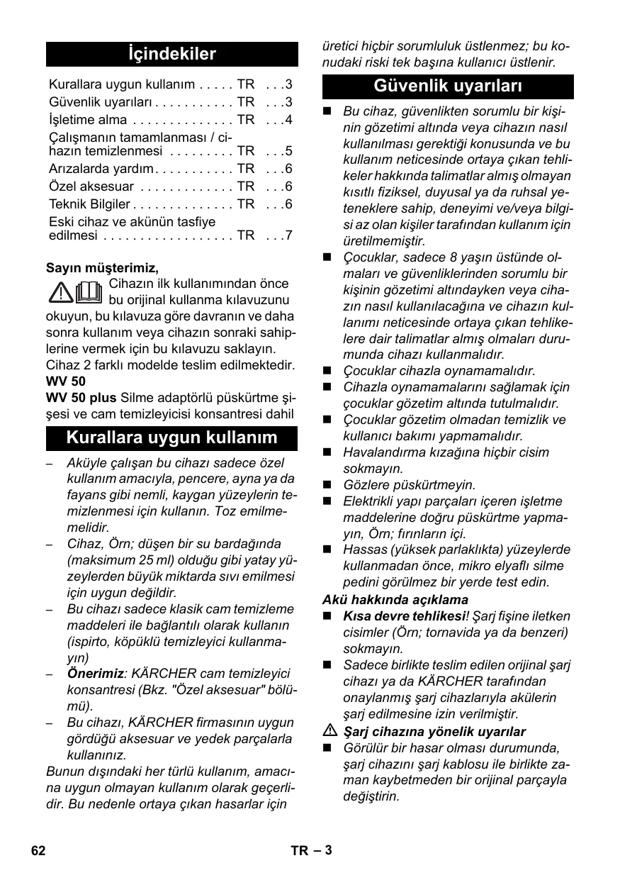 TR . . .7 Sayın müşterimiz, Cihazın ilk kullanımından önce bu orijinal kullanma kılavuzunu okuyun, bu kılavuza göre davranın ve daha sonra kullanım veya cihazın sonraki sahiplerine vermek için bu kılavuzu saklayın. Cihaz 2 farklı modelde teslim edilmektedir. WV 50 WV 50 plus Silme adaptörlü püskürtme şişesi ve cam temizleyicisi konsantresi dahil Kurallara uygun kullanım Aküyle çalışan bu cihazı sadece özel kullanım amacıyla, pencere, ayna ya da fayans gibi nemli, kaygan yüzeylerin temizlenmesi için kullanın. Toz emilmemelidir. – Cihaz, Örn; düşen bir su bardağında (maksimum 25 ml) olduğu gibi yatay yüzeylerden büyük miktarda sıvı emilmesi için uygun değildir. – Bu cihazı sadece klasik cam temizleme maddeleri ile bağlantılı olarak kullanın (ispirto, köpüklü temizleyici kullanmayın) – Önerimiz: KÄRCHER cam temizleyici konsantresi (Bkz. "Özel aksesuar" bölümü). – Bu cihazı, KÄRCHER firmasının uygun gördüğü aksesuar ve yedek parçalarla kullanınız. Bunun dışındaki her türlü kullanım, amacına uygun olmayan kullanım olarak geçerlidir. Bu nedenle ortaya çıkan hasarlar için