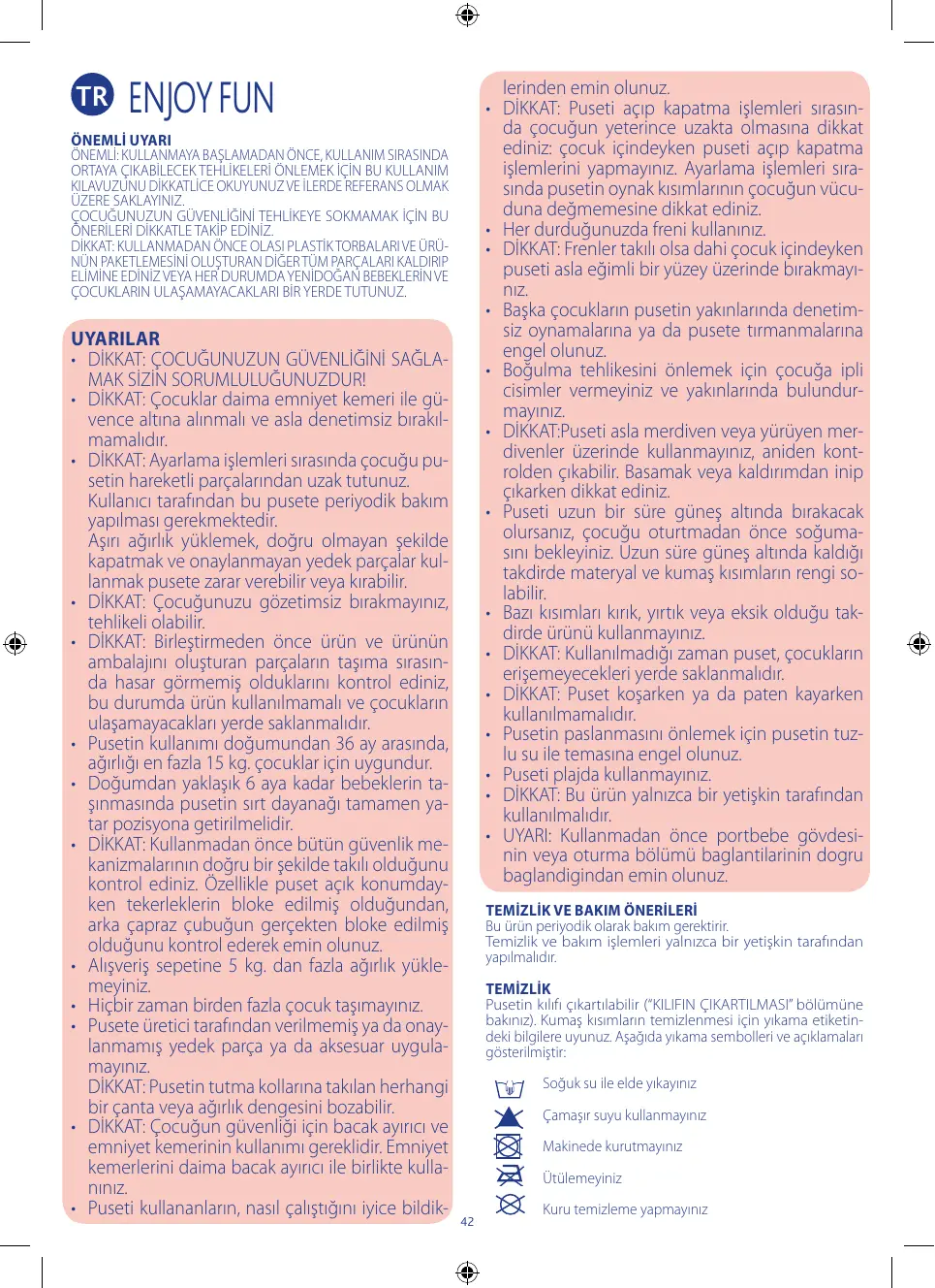 Pusetin kılıfı çıkartılabilir (“KILIFIN ÇIKARTILMASI” bölümüne bakınız). Kumaş kısımların temizlenmesi için yıkama etiketindeki bilgilere uyunuz. Aşağıda yıkama sembolleri ve açıklamaları gösterilmiştir: Soğuk su ile elde yıkayınız Çamaşır suyu kullanmayınız Makinede kurutmayınız Ütülemeyiniz