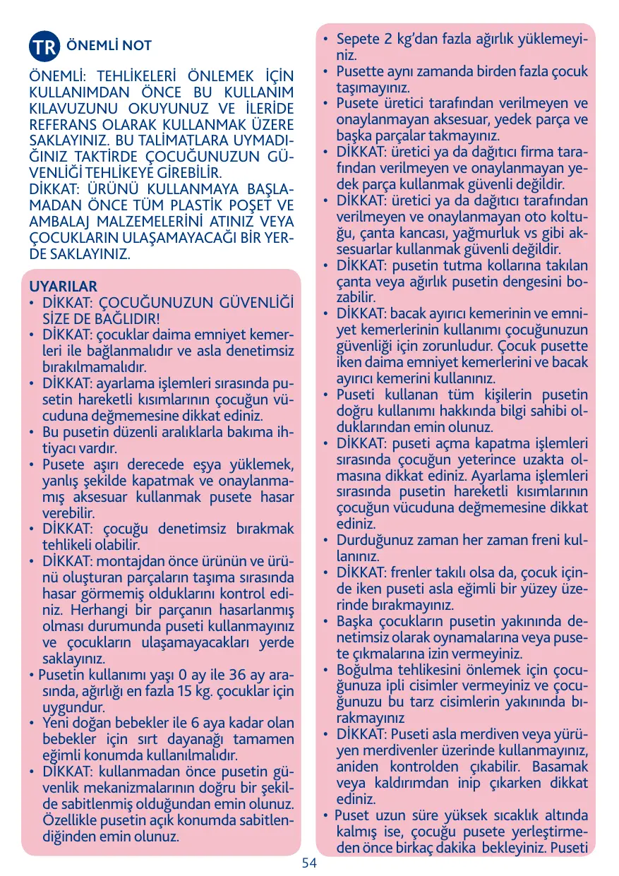 ÖNEMLİ: TEHLİKELERİ ÖNLEMEK İÇİN KULLANIMDAN ÖNCE BU KULLANIM KILAVUZUNU OKUYUNUZ VE İLERİDE REFERANS OLARAK KULLANMAK ÜZERE SAKLAYINIZ. BU TALİMATLARA UYMADIĞINIZ TAKTİRDE ÇOCUĞUNUZUN GÜVENLİĞİ TEHLİKEYE GİREBİLİR. DİKKAT: ÜRÜNÜ KULLANMAYA BAŞLAMADAN ÖNCE TÜM PLASTİK POŞET VE AMBALAJ MALZEMELERİNİ ATINIZ VEYA ÇOCUKLARIN ULAŞAMAYACAĞI BİR YERDE SAKLAYINIZ. UYARILAR • DİKKAT: ÇOCUĞUNUZUN GÜVENLİĞİ SİZE DE BAĞLIDIR! • DİKKAT: çocuklar daima emniyet kemerleri ile bağlanmalıdır ve asla denetimsiz bırakılmamalıdır. • DİKKAT: ayarlama işlemleri sırasında pusetin hareketli kısımlarının çocuğun vücuduna değmemesine dikkat ediniz. • Bu pusetin düzenli aralıklarla bakıma ihtiyacı vardır. • Pusete aşırı derecede eşya yüklemek, yanlış şekilde kapatmak ve onaylanmamış aksesuar kullanmak pusete hasar verebilir. • DİKKAT: çocuğu denetimsiz bırakmak tehlikeli olabilir. • DİKKAT: montajdan önce ürünün ve ürünü oluşturan parçaların taşıma sırasında hasar görmemiş olduklarını kontrol ediniz. Herhangi bir parçanın hasarlanmış olması durumunda puseti kullanmayınız ve çocukların ulaşamayacakları yerde saklayınız. • Pusetin kullanımı yaşı 0 ay ile 36 ay arasında, ağırlığı en fazla 15 kg. çocuklar için uygundur. • Yeni doğan bebekler ile 6 aya kadar olan bebekler için sırt dayanağı tamamen eğimli konumda kullanılmalıdır. • DİKKAT: kullanmadan önce pusetin güvenlik mekanizmalarının doğru bir şekilde sabitlenmiş olduğundan emin olunuz. Özellikle pusetin açık konumda sabitlendiğinden emin olunuz. 54