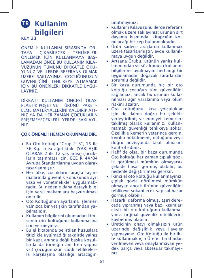- Üreticinin onayı olmaksızın ürün üzerinde değişiklik veya ilaveler yapmayınız. Oto Koltuğu ile birlikte kullanmak için Üretici tarafından verilmeyen veya onaylanmayan yedek parça veya aksesuar takmayınız. bilgileri KEY 23
