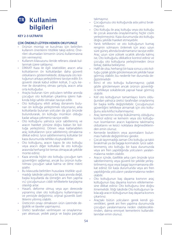 - Bu kılavuzda belirtilen hususlara titizlikle uyulmadığı takdirde yalnızca bir kaza anında değil, başka koşullarda da (örneğin ani fren yapma vs.) çocuğunuzun ciddi tehlikelerle karşılaşma olasılığı artar.