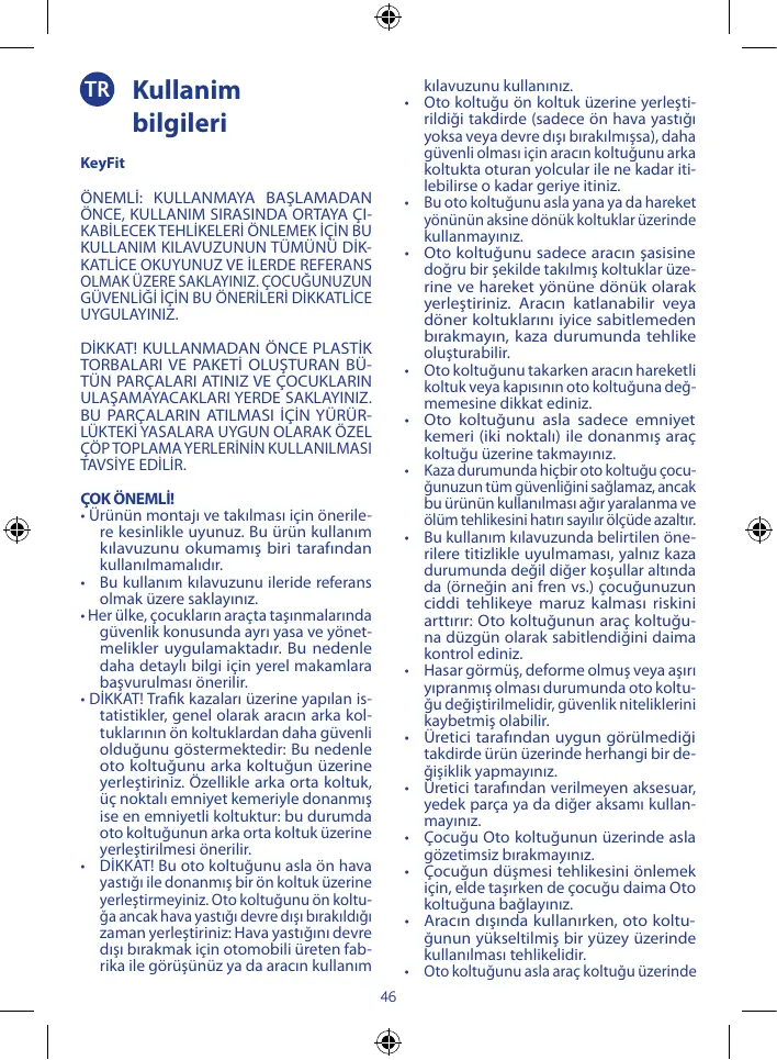 kilavuzunu kullanunz. Oto koltuu ôn koltuk üzerine yerlesti rildigi takdirde (sadece ôn hava yastigt yoksa veya devre disr birakalmissa), daha güvenl olmastigin aracin Koltugunu arka Koltukta oturan yolcular ile ne kadar it- lebilirse o kadar geriye itiniz. Bu oto koltugunu asla yana ya da hareket yônünün aksine dônük koltuklar üzerinde Kullanmayinez. Oto koltugunu sadece aracin sasisine doÿru bir sekilde takiimis Koltuklar üze- rine ve hareket yününe dünük olarak yerlestiriniz. Aracin katlanabilir veya dôner koltuklarini iyice sabitlemeden birakmayin, kaza durumunda tehlike olusturabilir Oto koltugunu takarken aracin hareketli Koltuk veya kapisinin oto koltuguna deg- memesine dikkat ediniz. Oto koltugunu asla sadece emniyet kemeri (iki noktall) ile donanmis araç Koltuu üzerine takmayiniz. Kaza durumunda hicbir oto koltugu çocu- gunuzun tüm güvenligini saglamaz, ancak bu ürünün kullanimasi agr yaralanma ve &lüm tehlikesini hat say 6lçude azaltr. Bu kullanm kilavuzunda belirtlen üne- rilere titizlikle uyulmamasi, yalniz kaza durumunda degil diger kosullar altinda da (ôrneäin ani fren vs.) çocugunuzun ciddi tehlikeye maruz kalmast riskini arttinr: Oto Koltugunun araç koltugu- na düzgün olarak sabitlendigini daima Kontrol ediniz. Hasar gôrmüs, deforme olmus veya agiri yipranmis olmasi durumunda oto koltu- Gu degistirimelidir, güventik niteliklerini kaybetmis olabilr. Üretici tarafindan uygun gôrülmedigi takdirde ürün üzerinde herhangi bir de- gti yapmaynz