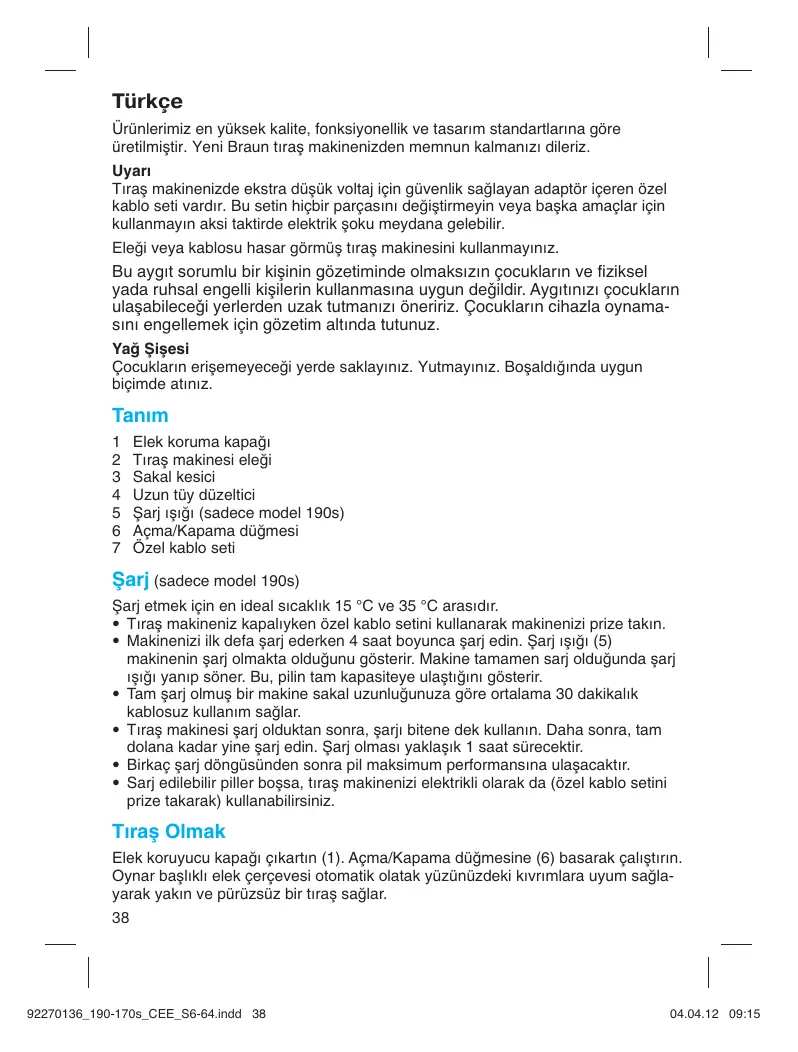 Türkçe Ürünlerimiz en yüksek kalite, fonksiyonellik ve tasarım standartlarına göre üretilmiştir. Yeni Braun tıraş makinenizden memnun kalmanızı dileriz. Uyarı Tıraş makinenizde ekstra düşük voltaj için güvenlik sağlayan adaptör içeren özel kablo seti vardır. Bu setin hiçbir parçasını değiştirmeyin veya başka amaçlar için kullanmayın aksi taktirde elektrik şoku meydana gelebilir. Eleği veya kablosu hasar görmüş tıraş makinesini kullanmayınız. Bu aygıt sorumlu bir kiμinin gözetiminde olmaksızın çocukların ve fiziksel yada ruhsal engelli kiμilerin kullanmasına uygun de©ildir. Aygıtınızı çocukların ulaμabilece©i yerlerden uzak tutmanızı öneririz. Çocukların cihazla oynamasını engellemek için gözetim altında tutunuz. Yağ Şişesi Çocukların erişemeyeceği yerde saklayınız. Yutmayınız. Boşaldığında uygun biçimde atınız. Tanım