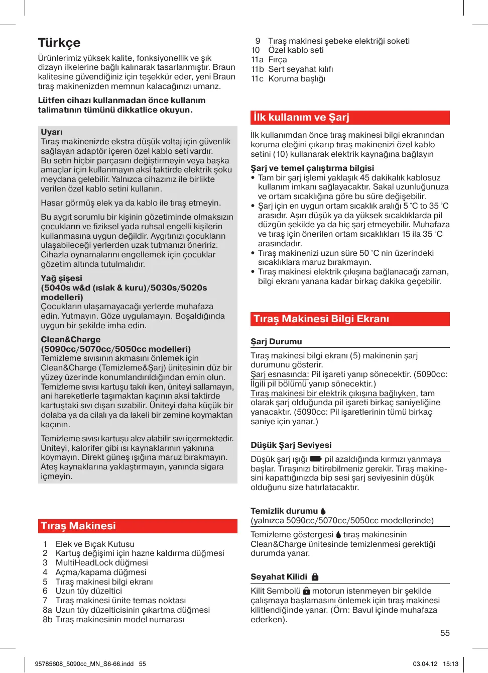 Türkçe Ürünlerimiz yüksek kalite, fonksiyonellik ve şık dizayn ilkelerine bağlı kalınarak tasarlanmıştır. Braun kalitesine güvendiğiniz için teşekkür eder, yeni Braun tıraş makinenizden memnun kalacağınızı umarız. Lütfen cihazı kullanmadan önce kullanım talimatının tümünü dikkatlice okuyun. Uyarı Tıraş makinenizde ekstra düşük voltaj için güvenlik sağlayan adaptör içeren özel kablo seti vardır. Bu setin hiçbir parçasını değiştirmeyin veya başka amaçlar için kullanmayın aksi taktirde elektrik şoku meydana gelebilir. Yalnızca cihazınız ile birlikte verilen özel kablo setini kullanın. Hasar görmüş elek ya da kablo ile tıraş etmeyin. Bu aygıt sorumlu bir kişinin gözetiminde olmaksızın çocukların ve fiziksel yada ruhsal engelli kişilerin kullanmasına uygun değildir. Aygıtınızı çocukların ulaşabileceği yerlerden uzak tutmanızı öneririz. Cihazla oynamalarını engellemek için çocuklar gözetim altında tutulmalıdır. Yağ şişesi (5040s w&d (ıslak & kuru)/5030s/5020s modelleri) Çocukların ulaşamayacağı yerlerde muhafaza edin. Yutmayın. Göze uygulamayın. Boşaldığında uygun bir şekilde imha edin. Clean&Charge (5090cc/5070cc/5050cc modelleri) Temizleme sıvısının akmasını önlemek için Clean&Charge (Temizleme&Şarj) ünitesinin düz bir yüzey üzerinde konumlandırıldığından emin olun. Temizleme sıvısı kartuşu takılı iken, üniteyi sallamayın, ani hareketlerle taşımaktan kaçının aksi taktirde kartuştaki sıvı dışarı sızabilir. Üniteyi daha küçük bir dolaba ya da cilalı ya da lakeli bir zemine koymaktan kaçının. Temizleme sıvısı kartuşu alev alabilir sıvı içermektedir. Üniteyi, kalorifer gibi ısı kaynaklarının yakınına koymayın. Direkt güneş ışığına maruz bırakmayın. Ateş kaynaklarına yaklaştırmayın, yanında sigara içmeyin. Tıraş Makinesi