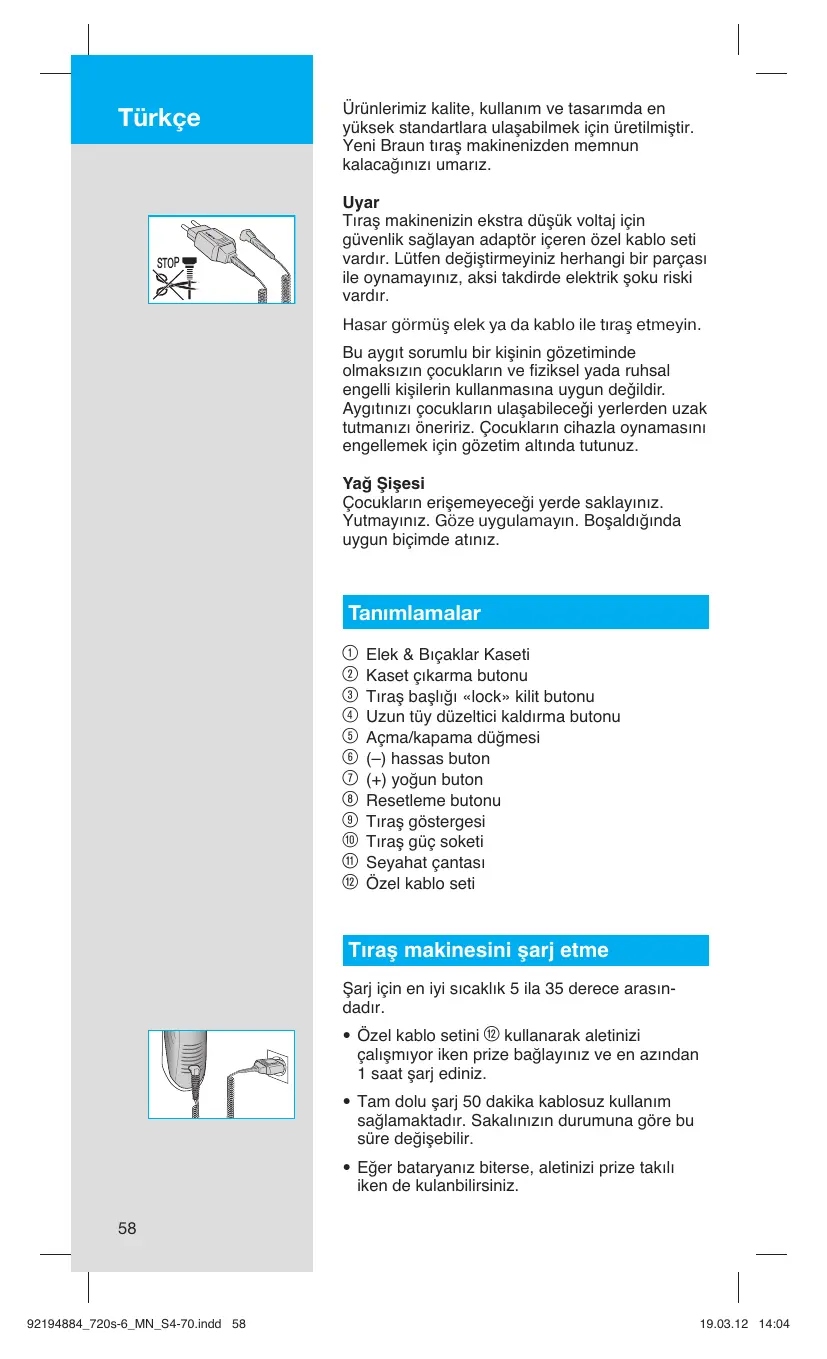 Türkçe STOP Ürünlerimiz kalite, kullanım ve tasarımda en yüksek standartlara ulaşabilmek için üretilmiştir. Yeni Braun tıraş makinenizden memnun kalacağınızı umarız. Uyar Tıraş makinenizin ekstra düşük voltaj için güvenlik sağlayan adaptör içeren özel kablo seti vardır. Lütfen değiştirmeyiniz herhangi bir parçası ile oynamayınız, aksi takdirde elektrik şoku riski vardır. Hasar görmüş elek ya da kablo ile tıraş etmeyin. Bu aygıt sorumlu bir kiμinin gözetiminde olmaksızın çocukların ve fiziksel yada ruhsal engelli kiμilerin kullanmasına uygun de©ildir. Aygıtınızı çocukların ulaμabilece©i yerlerden uzak tutmanızı öneririz. Çocukların cihazla oynamasını engellemek için gözetim altında tutunuz. Yağ Şişesi Çocukların erişemeyeceği yerde saklayınız. Yutmayınız. Göze uygulamayın. Boşaldığında uygun biçimde atınız. Tanımlamalar