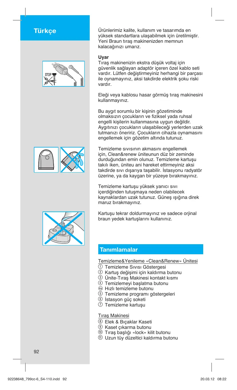 - Temizleme &Yenileme ünitesi için temizleme kartuşu CCR Çevre ile ilgili uyarılar Bu ürün şarj edilebilir piller içermektedir. Çevremizi korumak adına, lütfen kullanım ömrünün sonunda makinenizi evsel atıklarla beraber yok etmeyiniz. Yetkili Braun servislerine götürünüz ya da ülke yasalarına göre belirlenmiş toplama merkezlerine bırakınız. Temizleme sıvısı kartuşu evsel atıklarla beraber yok edilebilir. Bu bilgiler, bildirim yapılmadan değiştirilebilir. Özel kablo setinin üzerinde elektrikle ilgili ayrıntılar yer almaktadır. Bakanlıkça tespit ve ilan edilen kullanım ömrü yedi yıldır.
