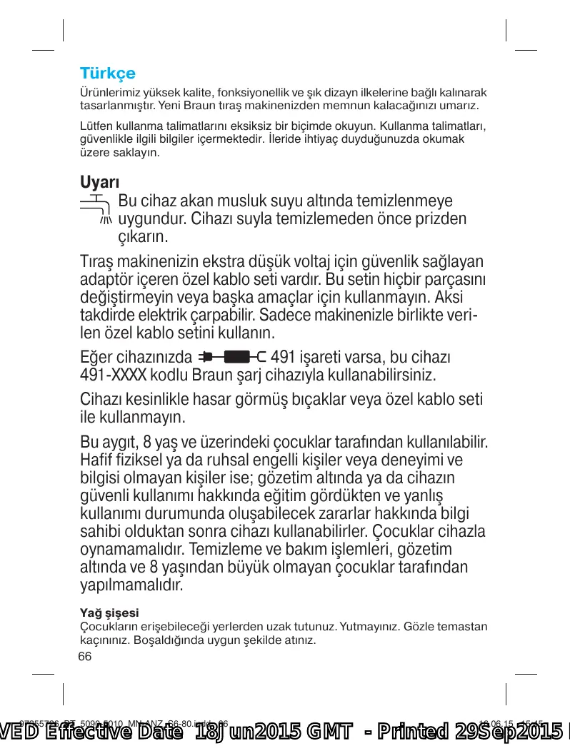 VED Effective Date 18Jun2015 GMT - Printed 29Sep2015 P Türkçe Ürünlerimiz yüksek kalite, fonksiyonellik ve şık dizayn ilkelerine bağlı kalınarak tasarlanmıştır. Yeni Braun tıraş makinenizden memnun kalacağınızı umarız. Lütfen kullanma talimatlarını eksiksiz bir biçimde okuyun. Kullanma talimatları, güvenlikle ilgili bilgiler içermektedir. leride ihtiyaç duyduğunuzda okumak üzere saklayın. Uyarı Bu cihaz akan musluk suyu altında temizlenmeye uygundur. Cihazı suyla temizlemeden önce prizden çıkarın. Tıraş makinenizin ekstra düşük voltaj için güvenlik sağlayan adaptör içeren özel kablo seti vardır. Bu setin hiçbir parçasını değiştirmeyin veya başka amaçlar için kullanmayın. Aksi takdirde elektrik çarpabilir. Sadece makinenizle birlikte verilen özel kablo setini kullanın. 491 işareti varsa, bu cihazı Eğer cihazınızda 491-XXXX kodlu Braun şarj cihazıyla kullanabilirsiniz. Cihazı kesinlikle hasar görmüş bıçaklar veya özel kablo seti ile kullanmayın. Bu aygıt, 8 yaş ve üzerindeki çocuklar tarafından kullanılabilir. Hafif fiziksel ya da ruhsal engelli kişiler veya deneyimi ve bilgisi olmayan kişiler ise; gözetim altında ya da cihazın güvenli kullanımı hakkında eğitim gördükten ve yanlış kullanımı durumunda oluşabilecek zararlar hakkında bilgi sahibi olduktan sonra cihazı kullanabilirler. Çocuklar cihazla oynamamalıdır. Temizleme ve bakım işlemleri, gözetim altında ve 8 yaşından büyük olmayan çocuklar tarafından yapılmamalıdır. Yağ şişesi Çocukların erişebileceği yerlerden uzak tutunuz. Yutmayınız. Gözle temastan kaçınınız. Boşaldığında uygun şekilde atınız.