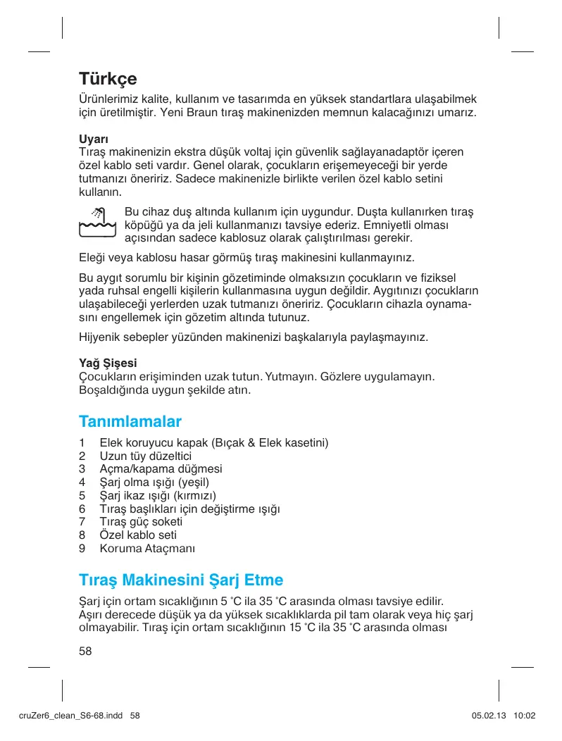 Türkçe Ürünlerimiz kalite, kullanım ve tasarımda en yüksek standartlara ulaşabilmek için üretilmiştir. Yeni Braun tıraş makinenizden memnun kalacağınızı umarız. Uyarı Tıraş makinenizin ekstra düşük voltaj için güvenlik sağlayanadaptör içeren özel kablo seti vardır. Genel olarak, çocukların erişemeyeceği bir yerde tutmanızı öneririz. Sadece makinenizle birlikte verilen özel kablo setini kullanın. Bu cihaz duş altında kullanım için uygundur. Duşta kullanırken tıraş köpüğü ya da jeli kullanmanızı tavsiye ederiz. Emniyetli olması açısından sadece kablosuz olarak çalıştırılması gerekir. Eleği veya kablosu hasar görmüş tıraş makinesini kullanmayınız. Bu aygıt sorumlu bir kiμinin gözetiminde olmaksızın çocukların ve fiziksel yada ruhsal engelli kiμilerin kullanmasına uygun de©ildir. Aygıtınızı çocukların ulaμabilece©i yerlerden uzak tutmanızı öneririz. Çocukların cihazla oynamasını engellemek için gözetim altında tutunuz. Hijyenik sebepler yüzünden makinenizi başkalarıyla paylaşmayınız. Yağ Şişesi Çocukların erişiminden uzak tutun. Yutmayın. Gözlere uygulamayın. Boşaldığında uygun şekilde atın. Tanımlamalar