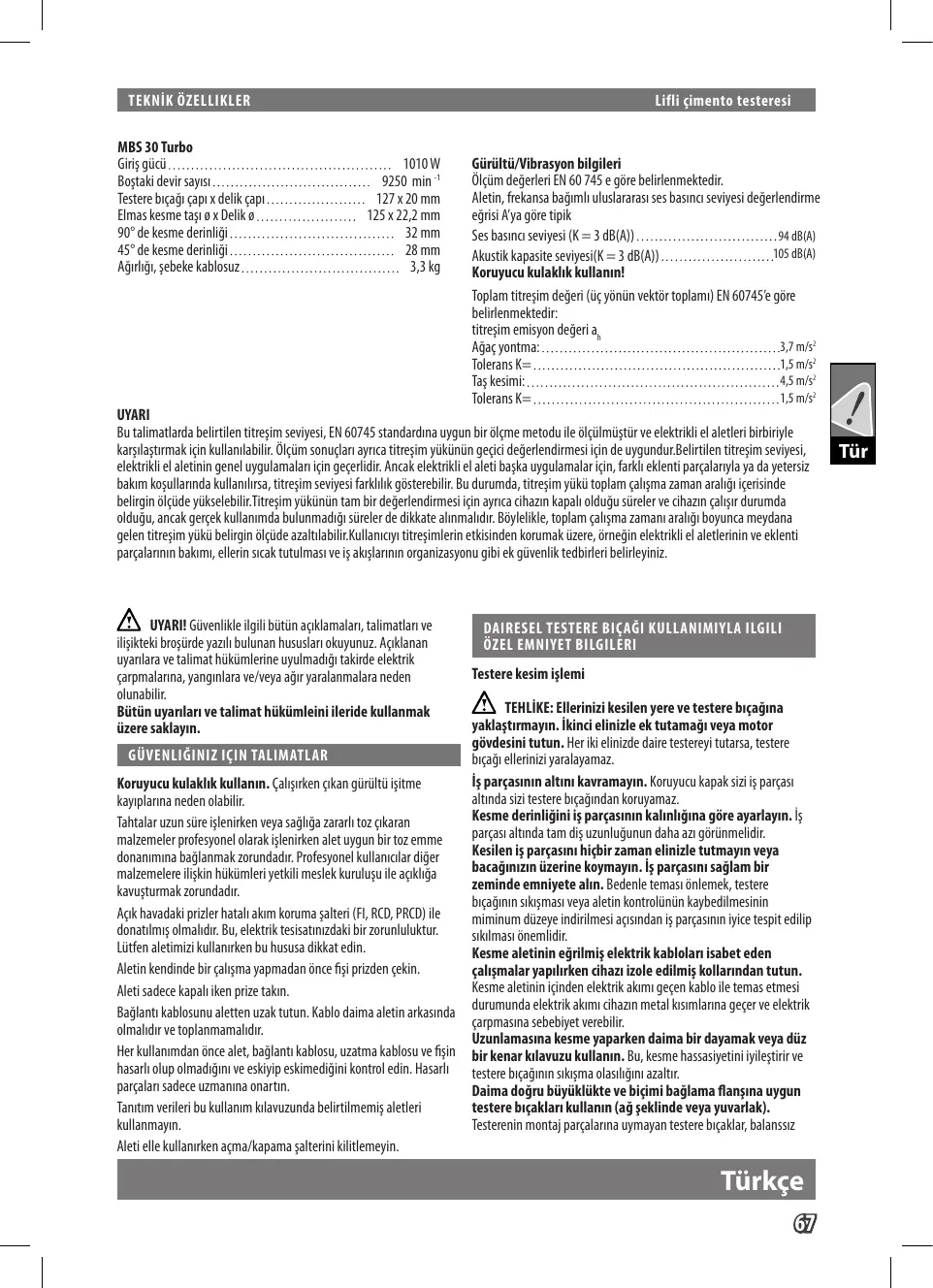 MBS 30 Turbo Gris gi 1010W Bostaki devir says 9250 min Testerebiçaÿs çapix del çapt 12720 mm Elmas kesme tas 0 x Dei 0 125x22,2mm 90° de kesme derinligi 32mm 45° de kesme derinligi 28mm Aüÿr, sebeke kablosuz… 33kg UYARI Bu tlimatlarda belirilen itresim seyes, EN 60745 standardina uygun ir élçme metodu ile Glçüimüstür ve elektrikl el aletlerbibirile Karllastrmak in kullanlabili. Ülüm sonuglan aynca tresim yükünün gegic degertendirmesi in de uygundurBelrtlen titreim seviyei, Gürültü/Vibrasyon bilgileri Ülgüm degerer EN 60 745€ gôre belirlenmektedir. Altin, frekansa bagimluluslraras ses basina seviyes degertendirme gris Aya gôretipik Ses bas seviyes (K = 3 dB(A)) Akustik kapaite seviesi(K = 3 dB(A). Koruyucu kulakhik kullanin! Toplam titresim degei (ie yônûün vektôr toplami) EN 60745 gôre belitenmektedir: titresim emisyon degeri a, Aüaçyontma: Tolerans K= Tskesimi: Tolerans =. 94 dB) 105 dB) elektriki el aletiin genel uygulamalanigin gegerici. Ancak elektrkl el aleti baska uygulamalar in, far eklenti parçalanyla ya da yetersiz bakim Kogullannda kullamrs, ttresim seviesi frkilik gésterbilir Bu durumda itreim yükütoplam çalisma zaman araliiersinde belginlçüde yükselebili: Titresim yükinün tam bi degerlendirmes in aynca cihazin kapal oldugu sürelerve chazn çlir durumda oldugu, ancak gerçekkullammda bulunmadi sürelr de dikkate alnmaldr. Béylelkl,toplam alima zamani are boyunca meydana gelentitresim yüki belirgin lçüde azaltlablirKulamaitresimlern etkisinden Korumak ze, men elektrki el aletlerinin ve eklenti parçalanmn bakim, éllrin scaktutulmasI ve is akslarmn organizasyonu gibiek güvenlik tedbieri belireyiniz. ZA uvaRt Givenike gi bütin agklamalan,taimatian ve iiskteki brosürde za bulunan hususlar okuyunu. Agklanan uyanlara ve alimat hükümlerine uyulmadirtakirdeelektrik arpmalara, yanginlara ve/veya aÿryaralanmalara neden olunabilir Bütün uyanlan ve talimat hükümleinileride kullanmak izere saklayin.