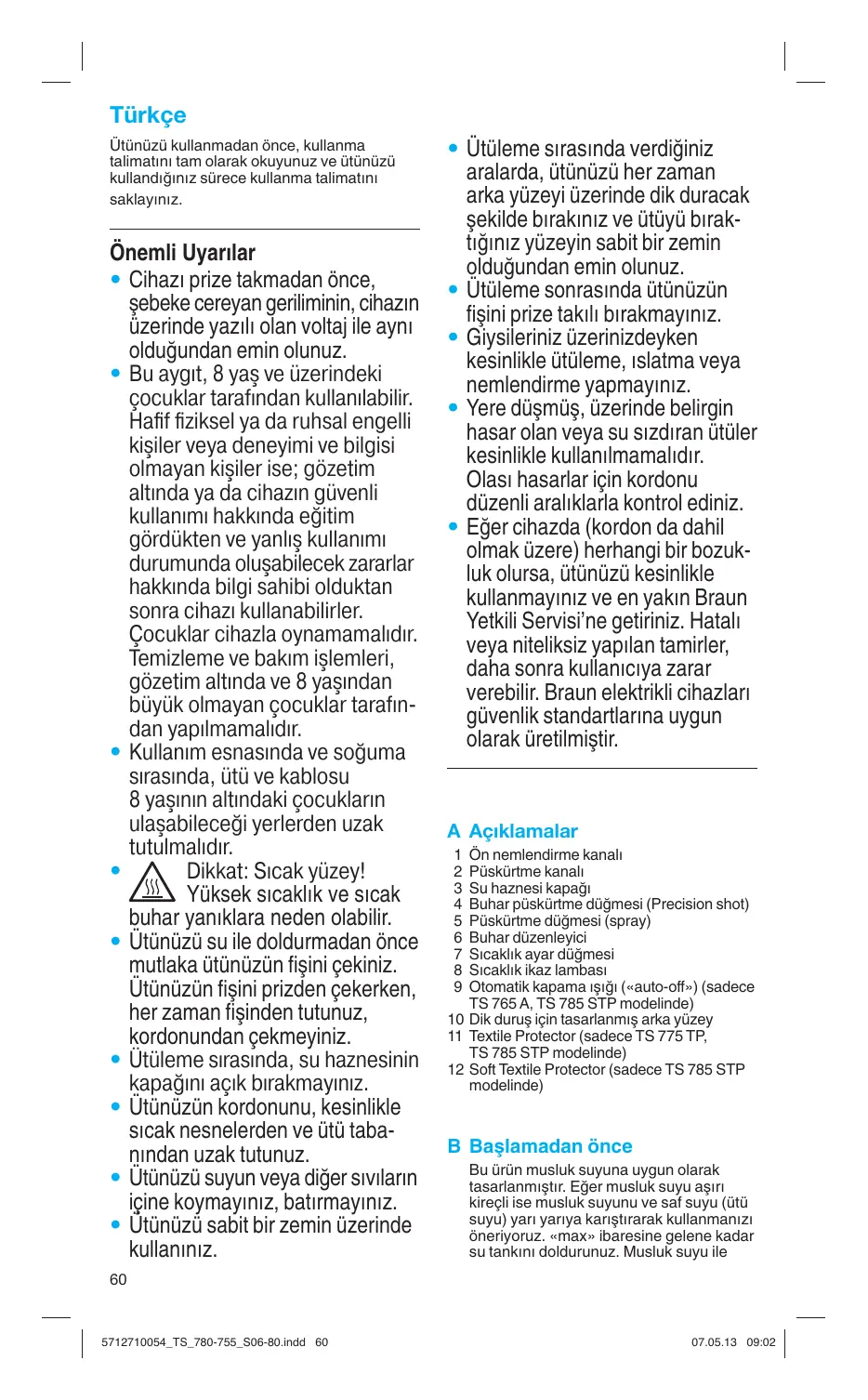 - Eπer cihazda (kordon da dahil olmak üzere) herhangi bir bozukluk olursa, ütünüzü kesinlikle kullanmayınız ve en yakın Braun Yetkili Servisi’ne getiriniz. Hatalı veya niteliksiz yapılan tamirler, daha sonra kullanıcıya zarar verebilir. Braun elektrikli cihazları güvenlik standartlarına uygun olarak üretilmiμtir. A Açıklamalar