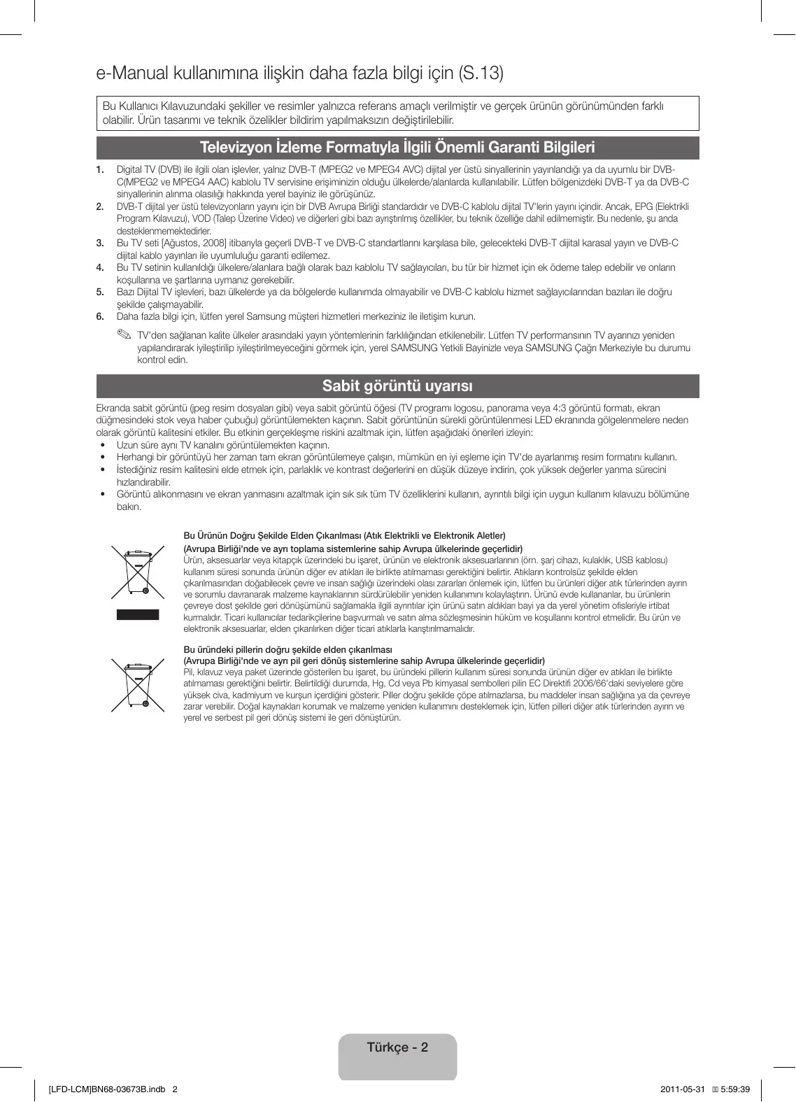 Sabit görüntü uyarısı Ekranda sabit görüntü (jpeg resim dosyaları gibi) veya sabit görüntü öğesi (TV programı logosu, panorama veya 4:3 görüntü formatı, ekran düğmesindeki stok veya haber çubuğu) görüntülemekten kaçının. Sabit görüntünün sürekli görüntülenmesi LED ekranında gölgelenmelere neden olarak görüntü kalitesini etkiler. Bu etkinin gerçekleşme riskini azaltmak için, lütfen aşağıdaki önerileri izleyin: • Uzun süre aynı TV kanalını görüntülemekten kaçının. • Herhangi bir görüntüyü her zaman tam ekran görüntülemeye çalışın, mümkün en iyi eşleme için TV'de ayarlanmış resim formatını kullanın. • İstediğiniz resim kalitesini elde etmek için, parlaklık ve kontrast değerlerini en düşük düzeye indirin, çok yüksek değerler yanma sürecini hızlandırabilir. • Görüntü alıkonmasını ve ekran yanmasını azaltmak için sık sık tüm TV özelliklerini kullanın, ayrıntılı bilgi için uygun kullanım kılavuzu bölümüne bakın. Bu Ürünün Doğru Şekilde Elden Çıkarılması (Atık Elektrikli ve Elektronik Aletler) (Avrupa Birliği'nde ve ayrı toplama sistemlerine sahip Avrupa ülkelerinde geçerlidir) Ürün, aksesuarlar veya kitapçık üzerindeki bu işaret, ürünün ve elektronik aksesuarlarının (örn. şarj cihazı, kulaklık, USB kablosu) kullanım süresi sonunda ürünün diğer ev atıkları ile birlikte atılmaması gerektiğini belirtir. Atıkların kontrolsüz şekilde elden çıkarılmasından doğabilecek çevre ve insan sağlığı üzerindeki olası zararları önlemek için, lütfen bu ürünleri diğer atık türlerinden ayırın ve sorumlu davranarak malzeme kaynaklarının sürdürülebilir yeniden kullanımını kolaylaştırın. Ürünü evde kullananlar, bu ürünlerin çevreye dost şekilde geri dönüşümünü sağlamakla ilgili ayrıntılar için ürünü satın aldıkları bayi ya da yerel yönetim ofisleriyle irtibat kurmalıdır. Ticari kullanıcılar tedarikçilerine başvurmalı ve satın alma sözleşmesinin hüküm ve koşullarını kontrol etmelidir. Bu ürün ve elektronik aksesuarlar, elden çıkarılırken diğer ticari atıklarla karıştırılmamalıdır. Bu üründeki pillerin doğru şekilde elden çıkarılması (Avrupa Birliği'nde ve ayrı pil geri dönüş sistemlerine sahip Avrupa ülkelerinde geçerlidir) Pil, kılavuz veya paket üzerinde gösterilen bu işaret, bu üründeki pillerin kullanım süresi sonunda ürünün diğer ev atıkları ile birlikte atılmaması gerektiğini belirtir. Belirtildiği durumda, Hg, Cd veya Pb kimyasal sembolleri pilin EC Direktifi 2006/66'daki seviyelere göre yüksek civa, kadmiyum ve kurşun içerdiğini gösterir. Piller doğru şekilde çöpe atılmazlarsa, bu maddeler insan sağlığına ya da çevreye zarar verebilir. Doğal kaynakları korumak ve malzeme yeniden kullanımını desteklemek için, lütfen pilleri diğer atık türlerinden ayırın ve yerel ve serbest pil geri dönüş sistemi ile geri dönüştürün.