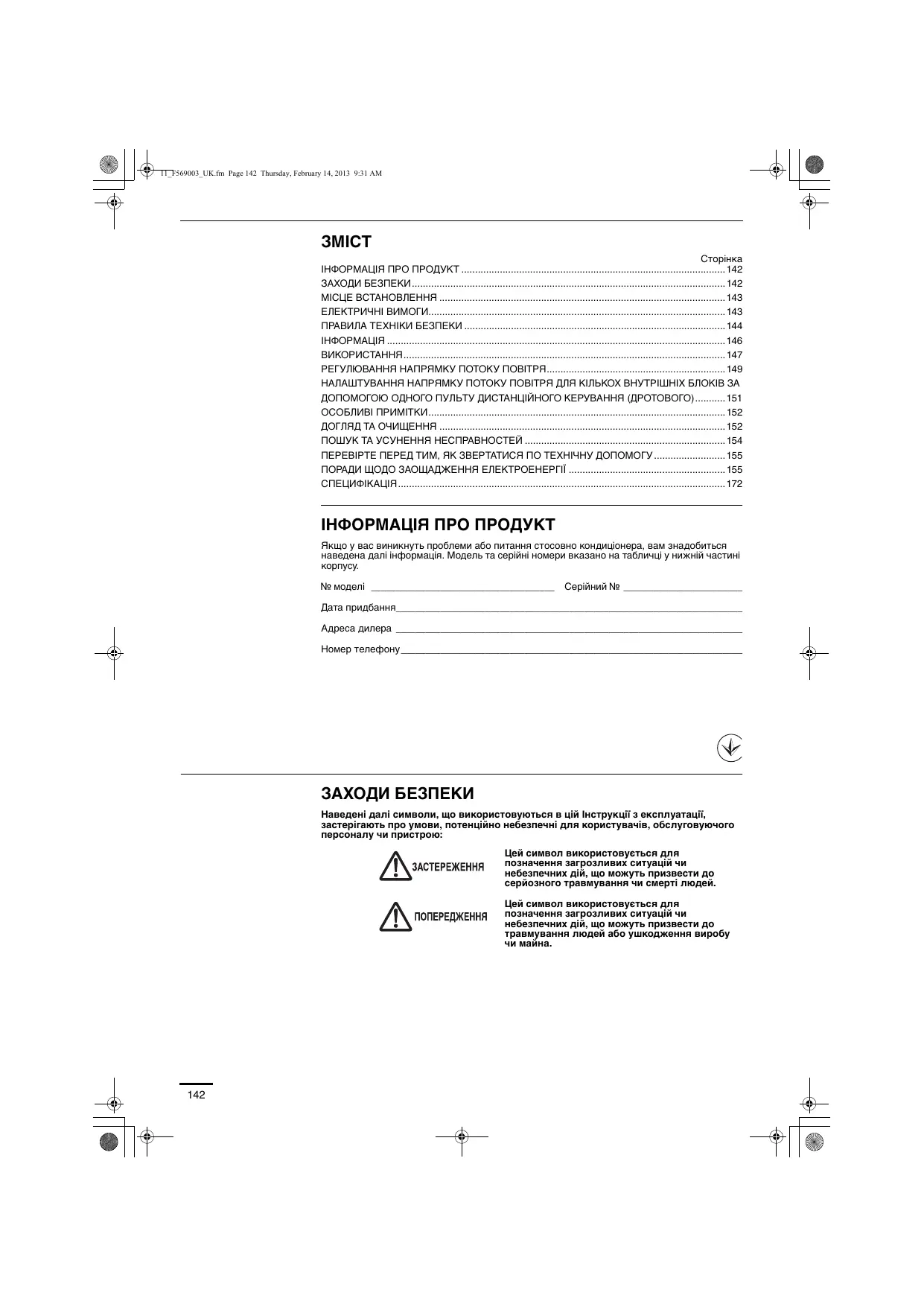 - СПЕЦИФІКАЦІЯ ІНФОРМАЦІЯ ПРО ПРОДУКТ Якщо у вас виникнуть проблеми або питання стосовно кондиціонера, вам знадобиться наведена далі інформація. Модель та серійні номери вказано на табличці у нижній частині № моделі _____________________________________ Серійний № ________________________ Дата придбання______________________________________________________________________ Адреса дилера ______________________________________________________________________ Номер телефону _____________________________________________________________________ ЗАХОДИ БЕЗПЕКИ Наведені далі символи, що використовуються в цій Інструкції з експлуатації, застерігають про умови, потенційно небезпечні для користувачів, обслуговуючого персоналу чи пристрою: Цей символ використовується для позначення загрозливих ситуацій чи небезпечних дій, що можуть призвести до серйозного травмування чи смерті людей. Цей символ використовується для позначення загрозливих ситуацій чи небезпечних дій, що можуть призвести до травмування людей або ушкодження виробу p. 172