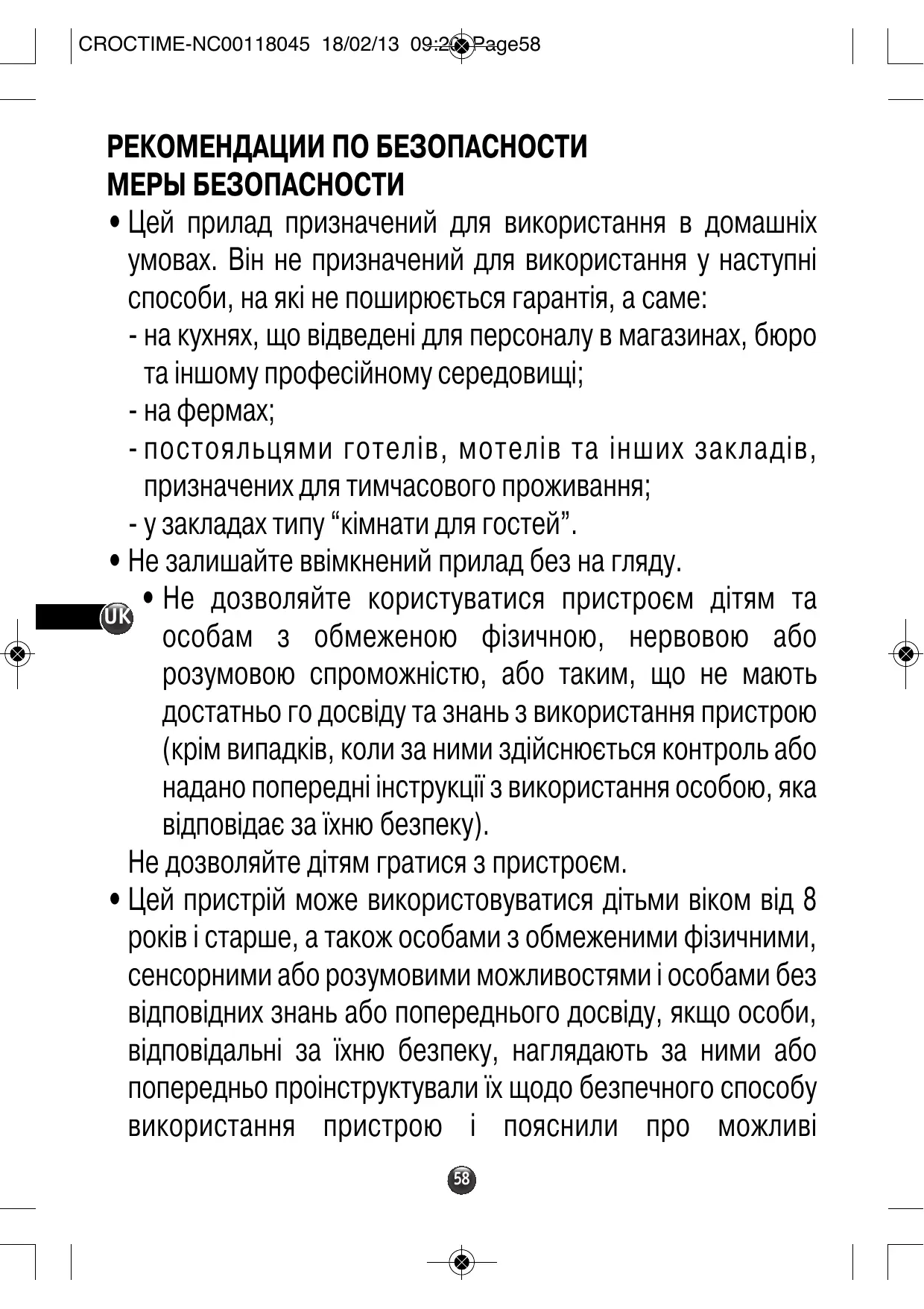 РЕКОМЕНДАЦИИ ПО БЕЗОПАСНОСТИ МЕРЫ БЕЗОПАСНОСТИ • Цей прилад призначений для використання в домашніх умовах. Він не призначений для використання у наступні способи, на які не поширюється гарантія, а саме: - на кухнях, що відведені для персоналу в магазинах, бюро та іншому професійному середовищі; - на фермах; - постояльцями готелів, мотелів та інших закладів, призначених для тимчасового проживання; - у закладах типу “кімнати для гостей”. • Не залишайте ввiмкнений прилад без на гляду. • Не дозволяйте користуватися пристроєм дiтям та UK особам з обмеженою фiзичною, нервовою або розумовою спроможнiстю, або таким, що не мають достатньо го досвiду та знань з використання пристрою (крiм випадкiв, коли за ними здiйснюється контроль або надано попереднi iнструкцiї з використання особою, яка вiдповiдає за їхню безпеку). Не дозволяйте дiтям гратися з пристроєм. • Цей пристрій може використовуватися дітьми віком від 8 років і старше, а також особами з обмеженими фізичними, сенсорними або розумовими можливостями і особами без відповідних знань або попереднього досвіду, якщо особи, відповідальні за їхню безпеку, наглядають за ними або попередньо проінструктували їх щодо безпечного способу використання пристрою і пояснили про можливі 58