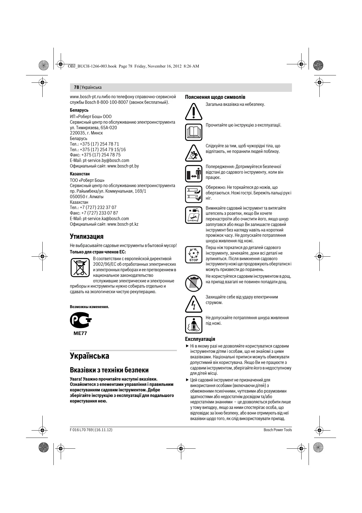 Вказівки з техніки безпеки Увага! Уважно прочитайте наступні вказівки. Ознайомтеся з елементами управління і правильним користуванням садовим інструментом. Добре зберігайте інструкцію з експлуатації для подальшого користування нею. F 016 L70 769 | (16.11.12) Ні в якому разі не дозволяйте користуватися садовим інструментом дітям і особам, що не знайомі з цими вказівками. Національні приписи можуть обмежувати допустимий вік користувача. Якщо Ви не працюєте з садовим інструментом, зберігайте його в недоступному для дітей місці. Цей садовий інструмент не призначений для використання особами (включаючи дітей) з обмеженими психічними, чуттєвими або розумовими здатностями або недостатнім досвідом та/або недостатніми знаннями – це дозволяється робити лише у тому випадку, якщо за ними спостерігає особа, що відповідає за їхню безпеку, або вони отримують від неї вказівки щодо того, як слід використовувати прилад. Bosch Power Tools OBJ_BUCH-1266-003.book Page 79 Friday, November 16, 2012 8:26 AM Українська | 79 Необхідно спостерігати за дітьми, щоб переконатися, що вони не грають з садовим інструментом. Ніколи не скошуйте траву, коли поблизу знаходяться люди, зокрема діти, або домашні тварини. За нещасні випадки, тілесні ушкодження інших людей і пошкодження чужого майна відповідає користувач. Не працюйте з садовими інструментом босоніж або у відкритих сандалях. Завжди майте на собі міцне взуття і довгі штани. Уважно огляньте ділянку, на якій Ви збираєтеся працювати, і приберіть каміння, дрючки, дроти, кістки і інші чужорідні предмети. Перед користуванням газонокосаркою завжди продивляйтеся, чи не зносилися і чи не пошкоджені ножі, гвинти ножів і ножовий вузол. Щоб уникнути дисбалансу, ножі і гвинти ножів, що зносилися або пошкоджені, завжди міняйте усі разом. Скошуйте траву лише при денному світлі або при доброму штучному освітленні. За можливістю не користуйтесь садовим інструментом на мокрій траві. Завжди йдіть спокійним кроком, ніколи не біжіть. Ніколи не користуйтеся садовим інструментом з пошкодженими захисними пристроями і кришками або без запобіжних пристроїв, як напр., без дефлектора та/або без кошика для скошеної трави. Скошування трави на косогорах може бути небезпечним. – Не скошуйте траву на занадто крутих схилах. – На схилах та на мокрій траві завжди слідкуйте за тим, щоб Ви стійко стояли на ногах. – На схилах завжди косіть газон поперек, а не вгору-вниз. – Якщо Ви працюєте на схилах, будьте особливо обережними на поворотах. – Будьте особливо обережними, коли Ви задкуєте або тягнете садовий інструмент за собою. – При скошуванні трави завжди штовхайте садовий інструмент поперед себе і ніколи не тягніть його до Нахиляти садовий інструмент для його перевезення, перевозити його через голі ділянки, а також до місця, де Ви збираєтесь скошувати траву, або з такого місця дозволяється лише, коли ножі стоять. При запуску садового інструменту і вмиканні мотора не нахиляйте садовий інструмент – за винятком тих випадків, коли це необхідно зважаючи на високу траву. У такому випадку піднімайте садовий інструмент, притискаючи рукоятку, лише наскільки це необхідно і лише з протилежного до Вас боку. Коли будете опускати садовий інструмент, слідкуйте за тим, щоб Ваші руки були на рукоятці. Вмикайте садовий інструмент, як описано в інструкції з експлуатації, і слідкуйте за тим, щоб 