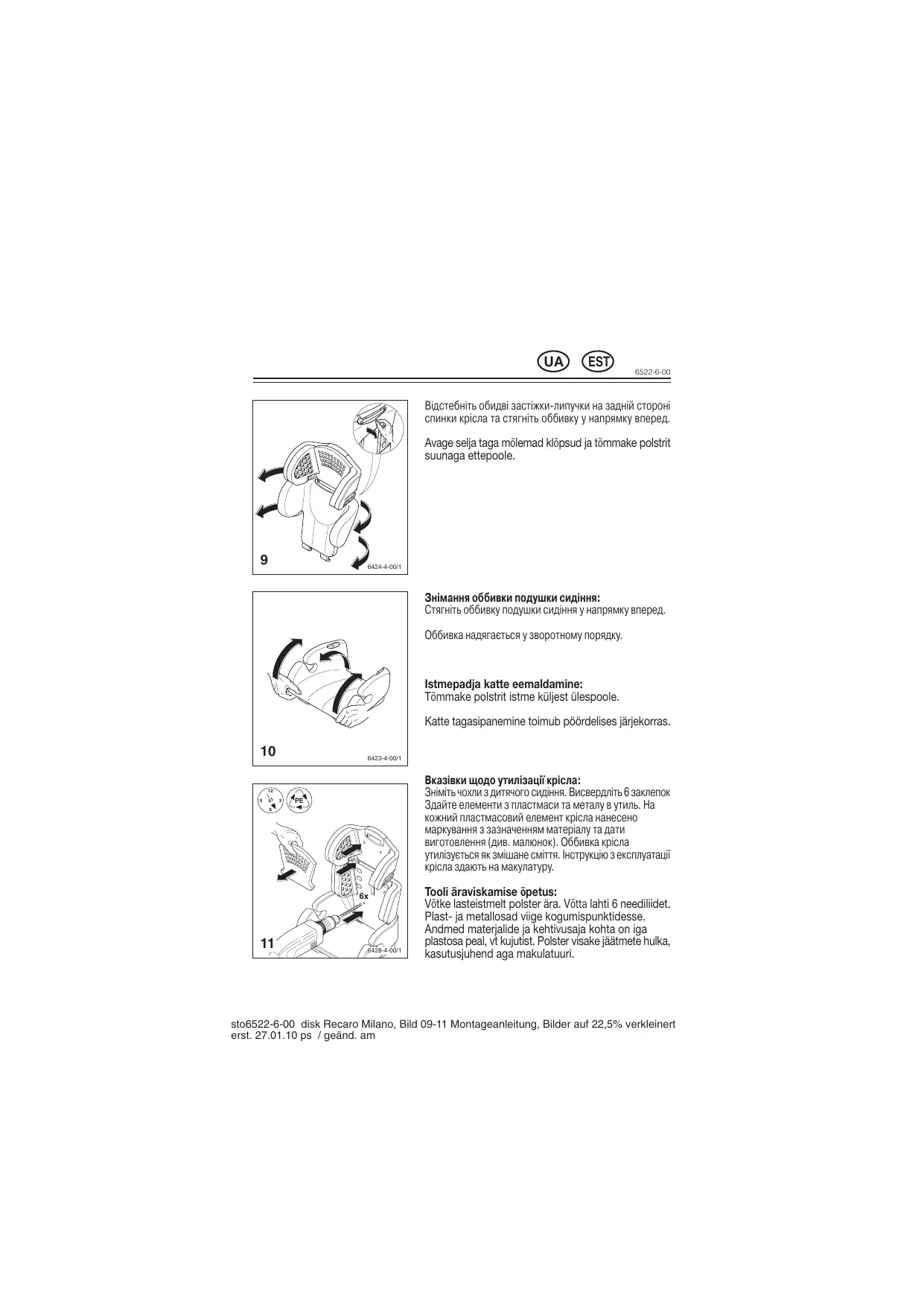 Вказiвки щодо утилiзацiї крiсла: Знiмiть чохли з дитячого сидiння. Висвердлiть 6 заклепок Здайте елементи з пластмаси та металу в утиль. На кожний пластмасовий елемент крiсла нанесено маркування з зазначенням матерiалу та дати виготовлення (див. малюнок). Оббивка крiсла утилiзується як змiшане смiття. Iнструкцiю з експлуатацiї крiсла здають на макулатуру.