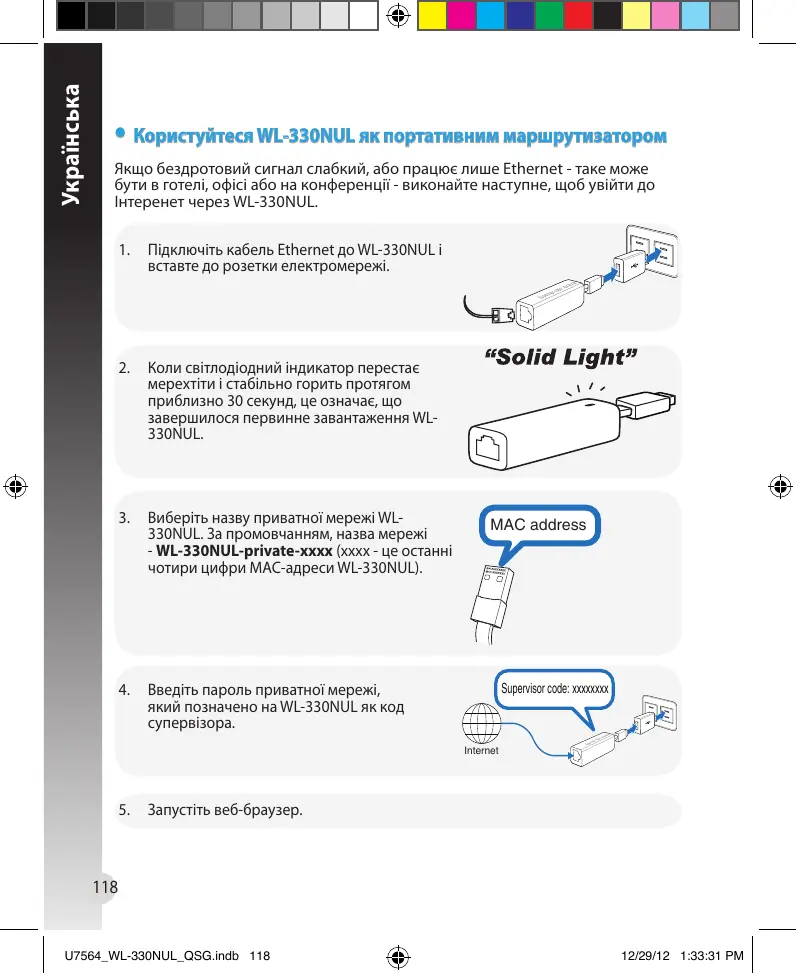 1. Підключіть до WL-330NUL назву приватної мережі. 2. Введіть ваш пароль приватної мережі. 3. Перейдіть до http://www.asusnetwork.net. 4. Введіть код супервізора, вказаний на поверхні WL-330NUL. 5. Відкрийте сторінку Wireless Setting (Бездротове налаштування). 6. Виберіть мережу Wi-Fi (SSID) і підключіться до Інтернет. 7. Запустіть веб-браузер і почніть перегляд сторінок в Інтернет.