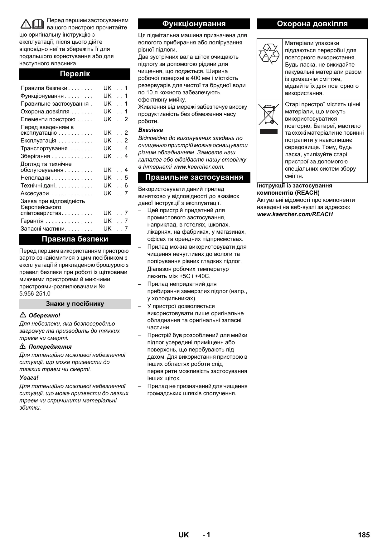 UK . . 7 UK . . 7 UK . . 7 Правила безпеки Перед першим використанням пристрою варто ознайомитися з цим посібником з експлуатації й прикладеною брошурою з правил безпеки при роботі із щітковими миючими пристроями й миючими пристроями-розпилювачами № 5.956-251.0 Знаки у посібнику