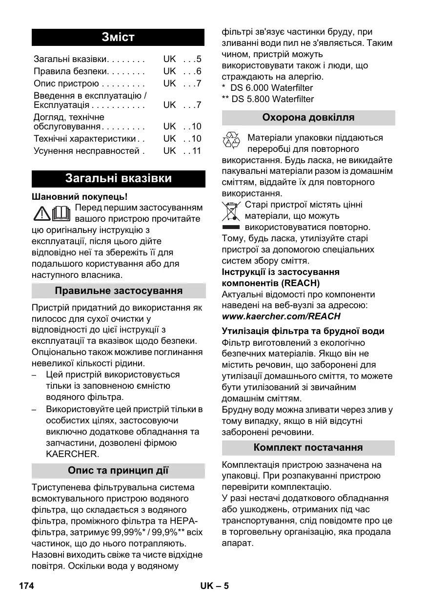 - DS 6.000 Waterfilter ** DS 5.800 Waterfilter Охорона довкілля Матеріали упаковки піддаються переробці для повторного використання. Будь ласка, не викидайте пакувальні матеріали разом із домашнім сміттям, віддайте їх для повторного використання. Старі пристрої містять цінні матеріали, що можуть використовуватися повторно. Тому, будь ласка, утилізуйте старі пристрої за допомогою спеціальних систем збору сміття. Інструкції із застосування компонентів (REACH) Актуальні відомості про компоненти наведені на веб-вузлі за адресою: www.kaercher.com/REACH Утилізація фільтра та брудної води Фільтр виготовлений з екологічно безпечних матеріалів. Якщо він не містить речовин, що заборонені для утилізації домашнього сміття, то можете бути утилізований зі звичайним домашнім сміттям. Брудну воду можна зливати через злив у тому випадку, якщо в ній відсутні заборонені речовини. Комплект постачання Комплектація пристрою зазначена на упаковці. При розпакуванні пристрою перевірити комплектацію. У разі нестачі додаткового обладнання або ушкоджень, отриманих під час транспортування, слід повідомте про це в торговельну організацію, яка продала