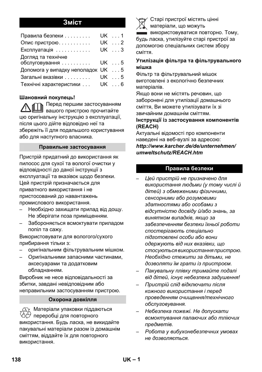 Старі пристрої містять цінні матеріали, що можуть використовуватися повторно. Тому, будь ласка, утилізуйте старі пристрої за допомогою спеціальних систем збору сміття. Утилізація фільтра та фільтрувального мішка Фільтр та фільтрувальний мішок виготовлені з екологічно безпечних матеріалів. Якщо вони не містять речовин, що заборонені для утилізації домашнього сміття, Ви можете утилізувати їх зі звичайним домашнім сміттям. Інструкції із застосування компонентів (REACH) Актуальні відомості про компоненти наведені на веб-вузлі за адресою: http://www.karcher.de/de/unternehmen/ umweltschutz/REACH.htm