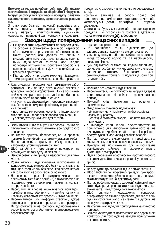 Заходи щодо попередження нещасних випадкiв • Не дозволяйте користуватися пристроєм дiтям та особам з обмеженою фiзичною, нервовою або розумовою спроможнiстю, або таким, що не мають достатнього досвiду та знань з використання пристрою (крiм випадкiв, коли за ними здiйснюється контроль або надано попереднi iнструкцiї з використання особою, яка вiдповiдає за їхню безпеку). Не дозволяйте дiтям гратися з пристроєм. • Пiд час роботи пристрою можливе пiдвищення температури вiдкритих поверхонь Не торкайтесь • Користуватися приладом поза приміщенням забороняється. Цей прилад призначений виключно для домашнього використання. Він не призначений для використання у наступні способи, на які не поширюється гарантія, а саме : - на кухнях, що відведені для персоналу в магазинах,бюро та іншому професійному середовищі; - на фермах; - постояльцями готелів, мотелів та інших закладів,призначених для тимчасового проживання; - у закладах типу «кімнати для гостей». 1 • Звiльнiть зовнiшню та внутрiшню поверхнi грилю вiд пакувального матерiалу, етикеток або додаткового приладдя. • Не ставте пристрiй безпосередньо на вразливi поверхнi (скляний стiл, скатертину, лакованi меблi). Не встановлюйте гриль на м’яку поверхню, наприклад кухонний рушник рушник. UK • Щоб запобi гти перегрiванню пристрою, не розмiщуйте йо го у кутку чи бiля стiни. • Завжди розміщуйте прилад в недоступних для дітей місцях. • Розташовуючи шнур живлення, пiдключений за допомогою подовжувача або без нього, стежте за тим, щоб гостi мо гли без перешкод перемiщатися навколо столу, не спотикаючись об ньо го. • Не залишайте гриль пiд прикрiпленими до стiни предметами меблi або полками, а також поряд з ле гкозаймистими матерiалами, такими як жалюзi, штори, драпiровка. • Перед тим як вперше користуватися приладом, помийте плитку або плитки, налийте на плитку невелику кiлькiсть олiї та протрiть м’якою тканиною. • Переконайтеся, що конфорки стабiльнi, добре встановленi i правильно прилягають до пристрою. Використовуйте лише конфорки, що постачаються разом iз пристроєм або купленi в авторизованому сервiсному центрi.