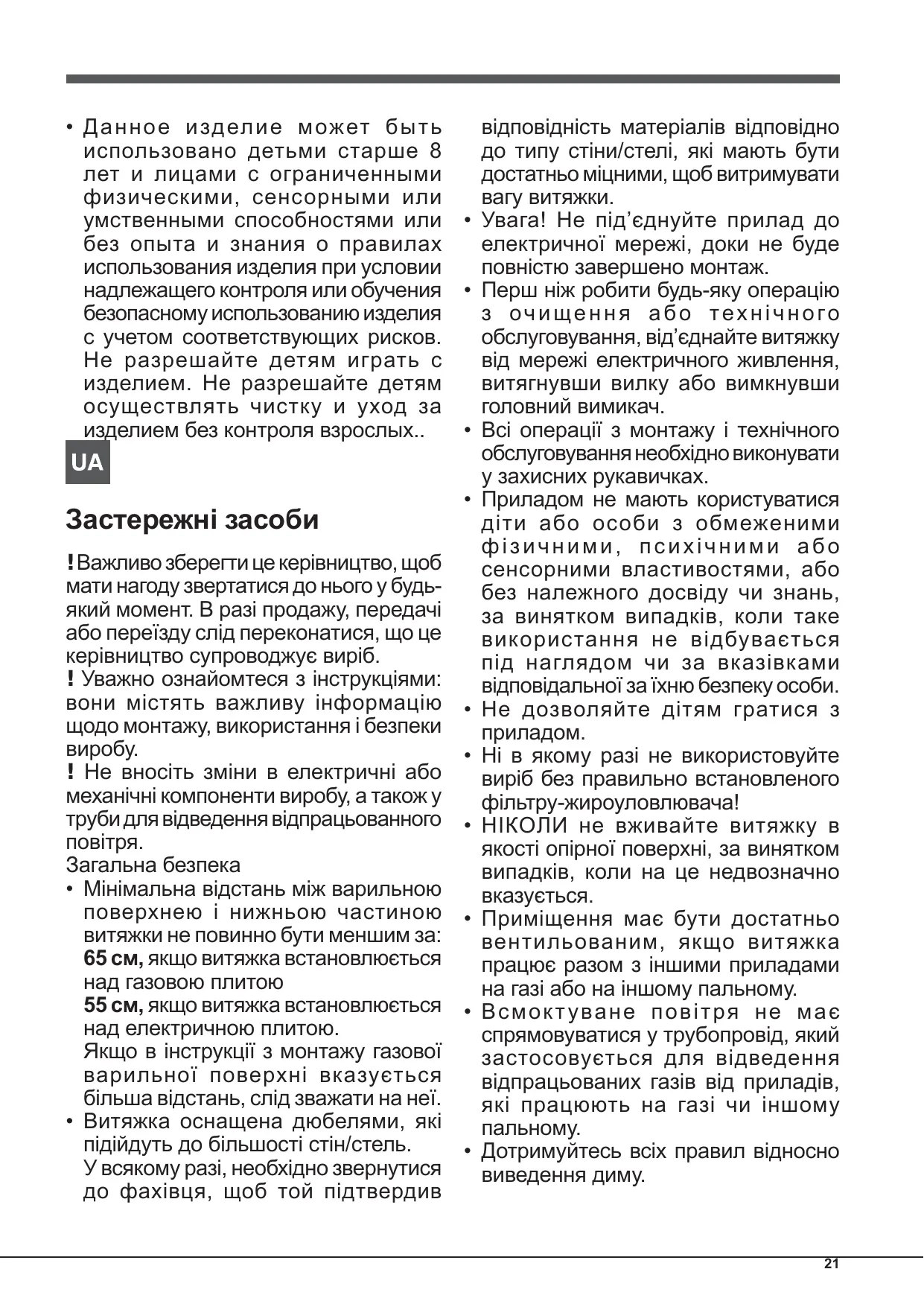 - Д а н н о е и зд ел и е м ож ет б ы т ь использовано детьми старше 8 лет и лицами с ограниченными физическими, сенсорными или умственными способностями или без опыта и знания о правилах использования изделия при условии надлежащего контроля или обучения безопасному использованию изделия с учетом соответствующих рисков. Не разрешайте детям играть с изделием. Не разрешайте детям осуществлять чистку и уход за изделием без контроля взрослых.. Застережні засоби ! Важливо зберегти це керівництво, щоб мати нагоду звертатися до нього у будьякий момент. В разі продажу, передачі або переїзду слід переконатися, що це керівництво супроводжує виріб. ! Уважно ознайомтеся з інструкціями: вони містять важливу інформацію щодо монтажу, використання і безпеки ! Не вносіть зміни в електричні або механічні компоненти виробу, а також у труби для відведення відпрацьованного Загальна безпека
