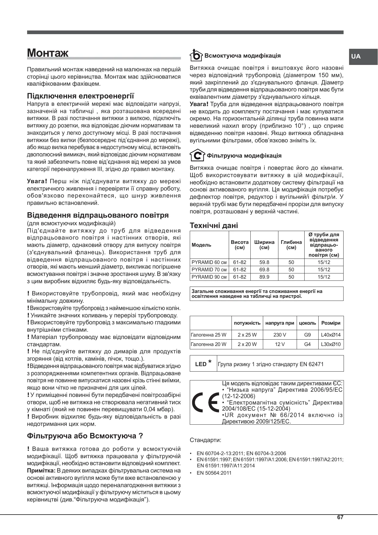 Витяжка очищає повітря і виштовхує його назовні через відповідний трубопровід (діаметром 150 мм), який закріплений до з'єднувального фланця. Діаметр труби для відведення відпрацьованого повітря має бути еквівалентним діаметру з'єднувального кільця. Увага! Труба для відведення відпрацьованого повітря не входить до комплекту постачання і має купуватися окремо. На горизонтальній ділянці труба повинна мати невеликий нахил вгору (приблизно 10°) , що сприяє відведенню повітря назовні. Якщо витяжка обладнана вугiльними фiльтрами, обов’язково знiмiть їх. Фiльтруюча модифiкацiя Витяжка очищає повітря і повертає його до кімнати. Щоб використовувати витяжку в цій модифікації, необхідно встановити додаткову систему фільтрації на основі активованого вугілля. Ця модифікація потребує дефлектор повітря, редуктор і вугільний/і фільтр/и. У верхній трубі має бути передбачені прорізи для випуску повітря, розташовані у верхній частині. Технічні дані PYRAMID 60 см PYRAMID 70 см PYRAMID 90 см