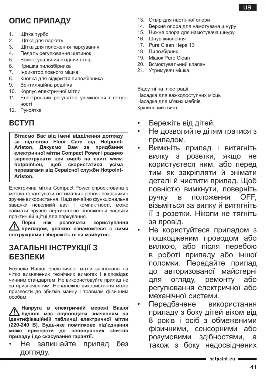 Вітаємо Вас від імені відділення догляду за підлогою Floor Care від HotpointAriston. Дякуємо Вам за придбання електричної мітли Compact Power і радимо зареєструвати цей виріб на сайті www. hotpoint.eu, щоб скористатися усіма перевагами від Сервісної служби HotpointAriston. Електрична мітла Compact Power спроектована з метою гарантувати оптимальні робочі показники і зручне використання. Надзвичайно функціональна завдяки невеликій вазі і компактності, може займати зручне вертикальне положення завдяки практичній щітці для паркування.