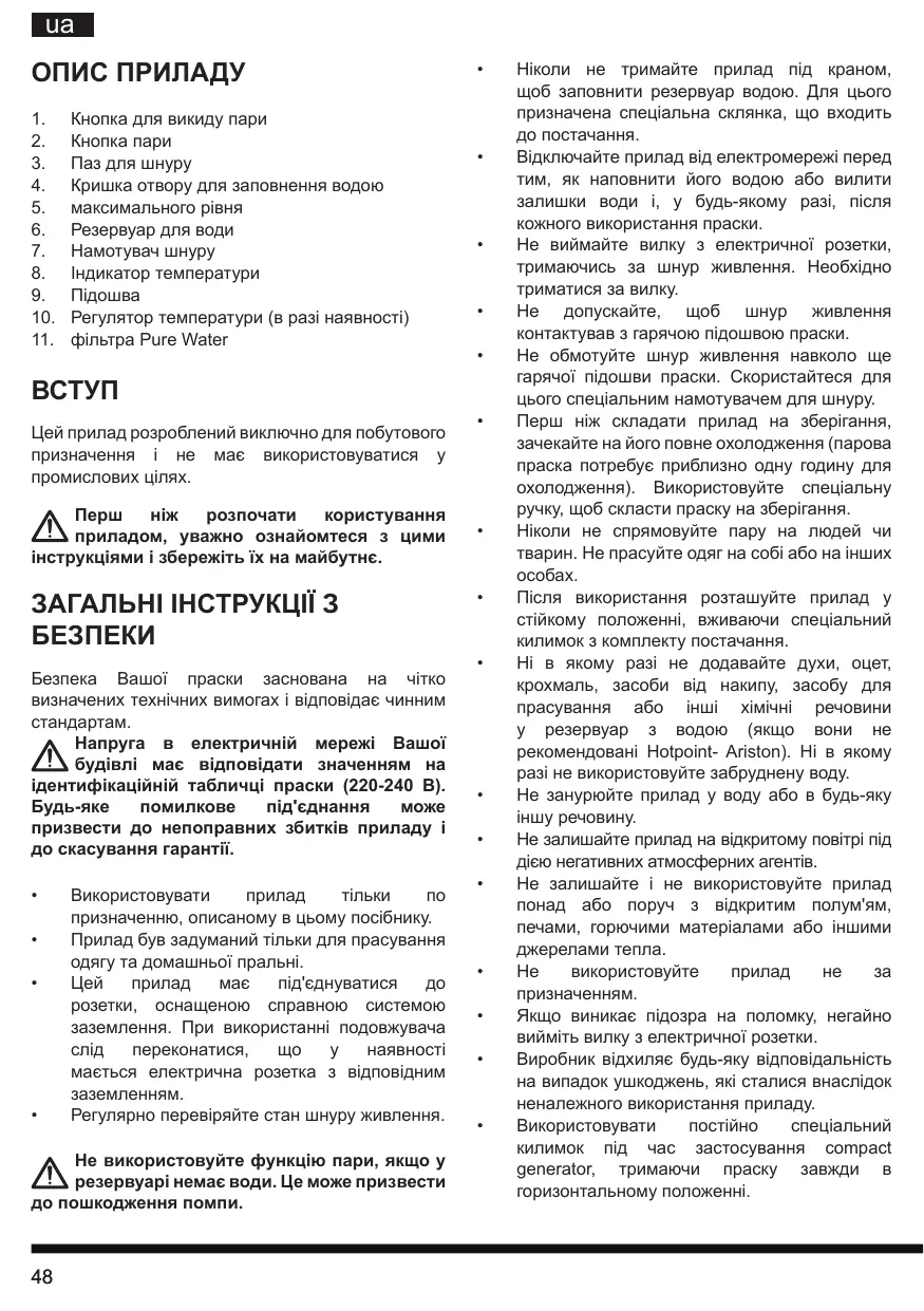 Hi B yompa3i He odaBaTe duxn, ouet, kpoxmaJIb, 3ac06n BiD hakiny, 3ac06y InpacyBaHHa 6o iHsi ximiuhi peOuHN y pe3epByap 3 BOIO (JaKIO BOHN He peKOMeHDoBahi Hotpoint-Ariston). Hi B yompa3i He BkOpncToByte 3a6pydHeHy BODY.
