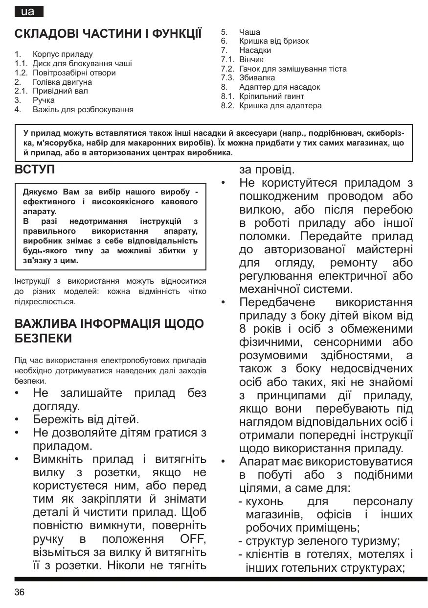 Не користуйтеся приладом з пошкодженим проводом або вилкою, або після перебою в роботі приладу або іншої поломки. Передайте прилад до авторизованої майстерні для огляду, ремонту або регулювання електричної або механічної системи. Передбачене використання приладу з боку дітей віком від 8 років і осіб з обмеженими фізичними, сенсорними або розумовими здібностями, а також з боку недосвідчених осіб або таких, які не знайомі з принципами дії приладу, якщо вони перебувають під наглядом відповідальних осіб і отримали попередні інструкції щодо використання приладу. Апарат має використовуватися в побуті або з подібними цілями, а саме для: