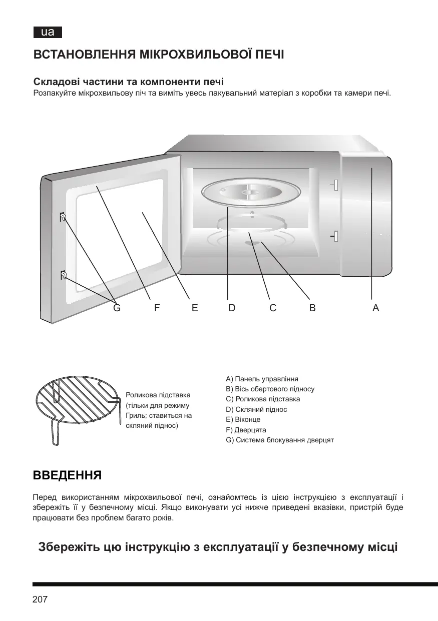 введення Перед використанням мікрохвильової печі, ознайомтесь із цією інструкцією з експлуатації і збережіть її у безпечному місці. Якщо виконувати усі нижче приведені вказівки, пристрій буде працювати без проблем багато років.