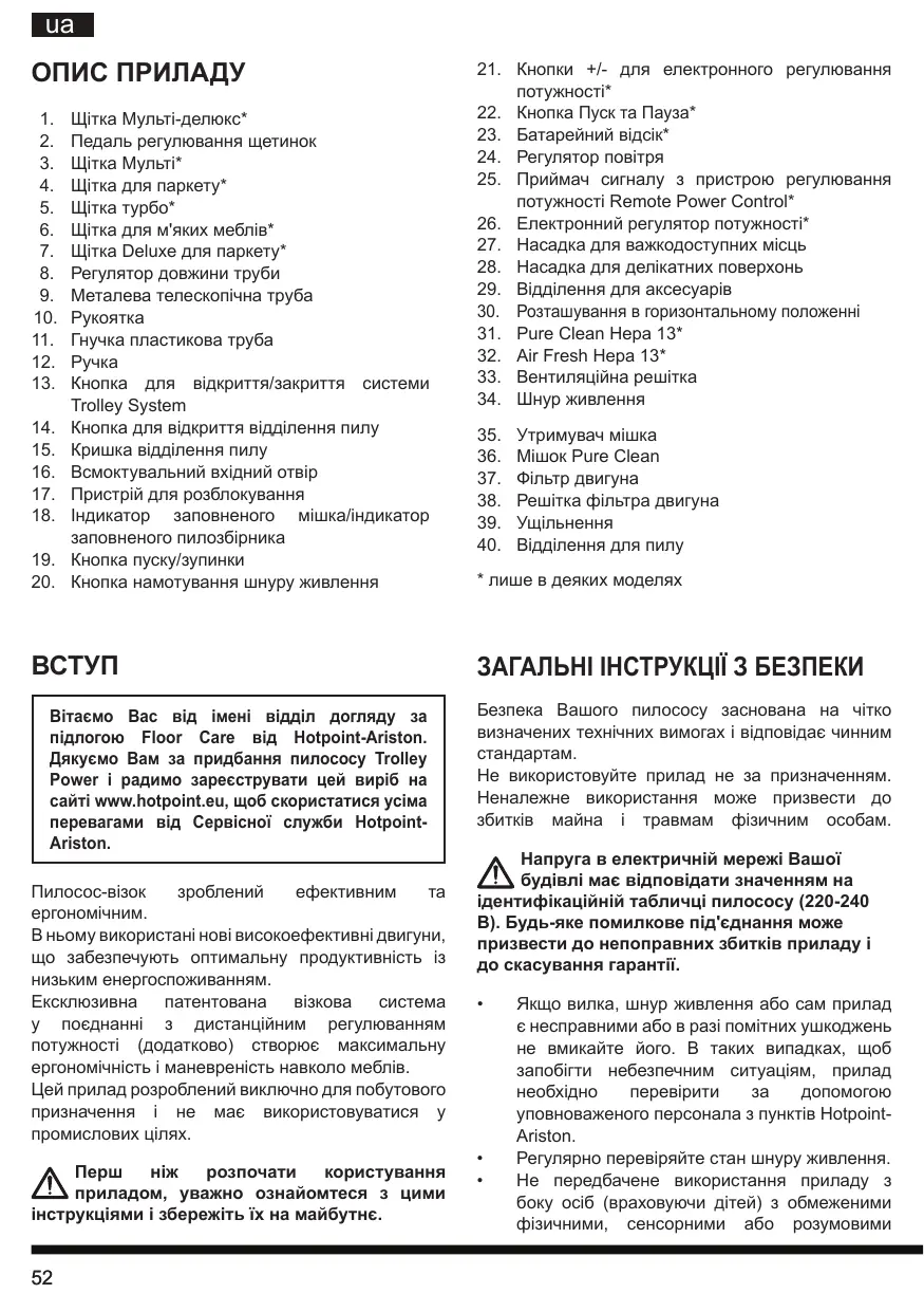 Вітаємо Вас від імені відділ догляду за підлогою Floor Care від Hotpoint-Ariston. Дякуємо Вам за придбання пилососу Trolley Power і радимо зареєструвати цей виріб на сайті www.hotpoint.eu, щоб скористатися усіма перевагами від Сервісної служби HotpointAriston. Пилосос-візок
