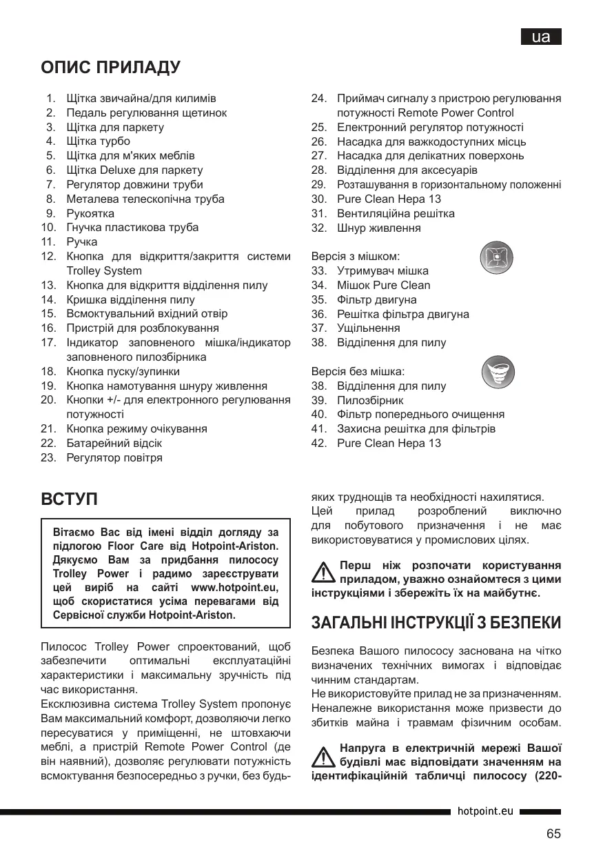 Вітаємо Вас від імені відділ догляду за підлогою Floor Care від Hotpoint-Ariston. Дякуємо Вам за придбання пилососу Trolley Power і радимо зареєструвати цей виріб на сайті www.hotpoint.eu, щоб скористатися усіма перевагами від Сервісної служби Hotpoint-Ariston. Пилосос Trolley Power спроектований, щоб забезпечити експлуатаційні характеристики і максимальну зручність під час використання. Ексклюзивна система Trolley System пропонує Вам максимальний комфорт, дозволяючи легко пересуватися у приміщенні, не штовхаючи меблі, а пристрій Remote Power Control (де він наявний), дозволяє регулювати потужність всмоктування безпосередньо з ручки, без будь-
