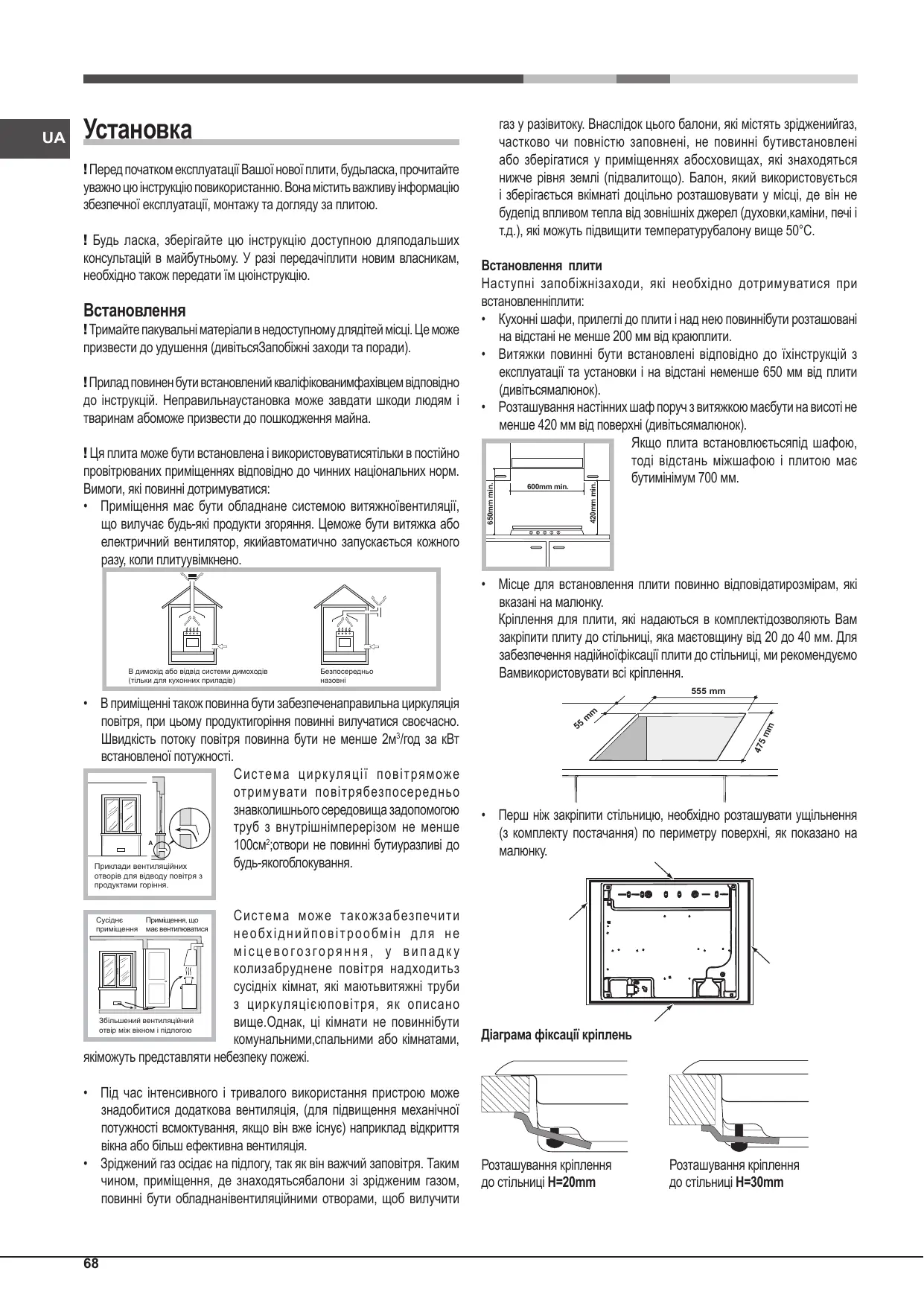- Місце для встановлення плити повинно відповідатирозмірам, які вказані на малюнку. Кріплення для плити, які надаються в комплектідозволяють Вам закріпити плиту до стільниці, яка маєтовщину від 20 до 40 мм. Для забезпечення надійноїфіксації плити до стільниці, ми рекомендуємо Вамвикористовувати всі кріплення. 555 mm