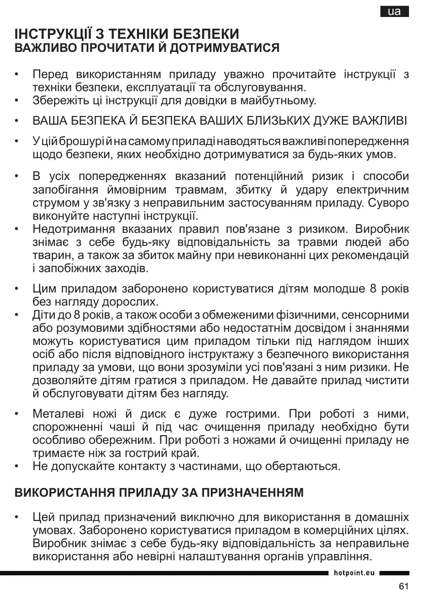 Цим приладом заборонено користуватися дітям молодше 8 років без нагляду дорослих. Діти до 8 років, а також особи з обмеженими фізичними, сенсорними або розумовими здібностями або недостатнім досвідом і знаннями можуть користуватися цим приладом тільки під наглядом інших осіб або після відповідного інструктажу з безпечного використання приладу за умови, що вони зрозуміли усі пов'язані з ним ризики. Не дозволяйте дітям гратися з приладом. Не давайте прилад чистити й обслуговувати дітям без нагляду. Металеві ножі й диск є дуже гострими. При роботі з ними, спорожненні чаші й під час очищення приладу необхідно бути особливо обережним. При роботі з ножами й очищенні приладу не тримаєте ніж за гострий край. Не допускайте контакту з частинами, що обертаються. ВИКОРИСТАННЯ ПРИЛАДУ ЗА ПРИЗНАЧЕННЯМ