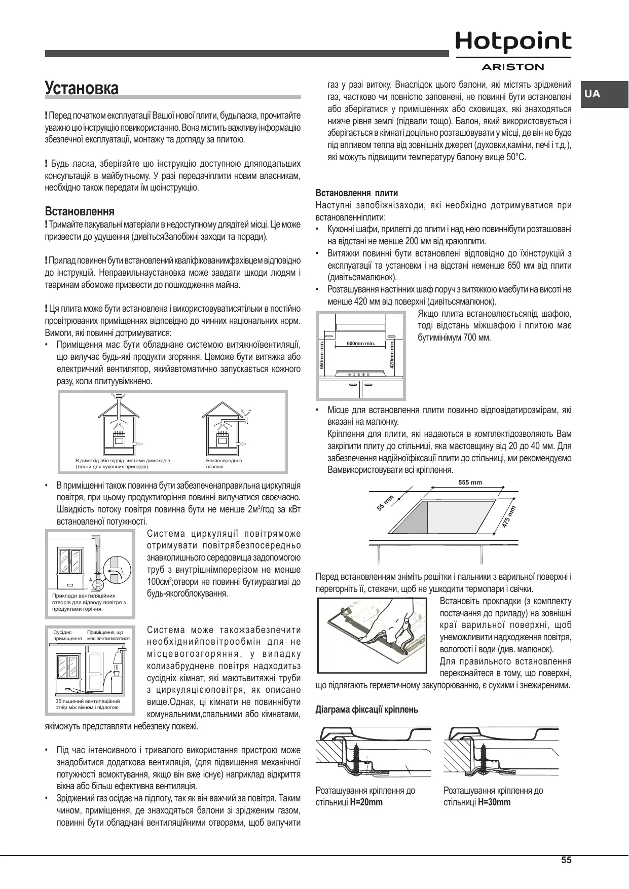 - Місце для встановлення плити повинно відповідатирозмірам, які вказані на малюнку. Кріплення для плити, які надаються в комплектідозволяють Вам закріпити плиту до стільниці, яка маєтовщину від 20 до 40 мм. Для забезпечення надійноїфіксації плити до стільниці, ми рекомендуємо Вамвикористовувати всі кріплення. 555 mm