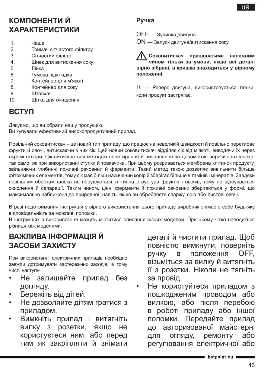 В разі перебоїв живлення прилад залишається ввімкненим і запускається знову, як тільки живлення поновлюється. Вимкніть прилад і витягніть вилку з розетки, якщо не користуєтеся ним, або перед тим як закріпляти й знімати деталі й чистити прилад. Щоб повністю вимкнути, поверніть ручку в положення OFF, візьміться за вилку й витягніть її з розетки. Ніколи не тягніть за провід. Уникайте контакту з деталями, що рухаються, й тримайте пальці далі від вихідних отворів і завантажувальної труби. Щоб запобігти травмам, такі ремонти як заміна пошкодженого проводу, мають виконуватися тільки в сервісних майстернях. Використання насадок, які не рекомендовані або не входять до комплекту продажу виробника, може спричинити пожежу, удар електричним струмом або травму. Не допускайте перегинання проводу через край стола й не торкайтеся гарячих поверхонь. Не користуйтеся цим приладом поблизу від джерел вибухових і/або займистих випаровувань. Не намагайтеся зламати механізм блокування кришки. Щоб зменшити ризик удару електричним струмом не намагайтеся зняти нижню кришку. Під нею немає жодних деталей, що потребують обслуговування користувачем. Ремонт можуть виконувати тільки особи, що мають спеціальний дозвіл. Не запускайте прилад пустим (без завантаження продукту), це може призвести до утворення неприємного звуку. Не намагайтеся вичавити сік з твердих матеріалів, що містять велике насіння (таке, що не можна проковтнути або прожувати), кісточки, лід або з заморожених продуктів. Якщо продукти застряють у завантажувальній трубі, не користуйтеся іншими засобами, крім рекомендованого штовхача. Завжди перевіряйте справність стану приладу й надійність кріплення всіх знімних деталей. Регулярно перевіряйте провід електроживлення й вилку на наявність пошкоджень. Торкатися ручки управління можна лише абсолютно сухими руками. Не вмикайте прилад більш, ніж на 30 хвилин.
